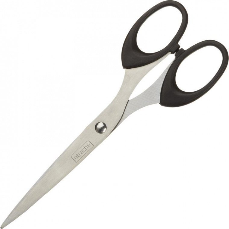 Канцелярские ножницы (офисные) Attache классического дизайна. Удлиненные лезвия выполнены из нержавеющей стали. Цвет колец — черный. Симметричные пластиковые ручки эллиптического формы обеспечивают комфортную работу с материалами любой плотности: бумага, картон, ткань, пленка. Двухсторонняя заточка лезвий. Длина ножниц — 16,9 см. Изделие поставляется на картонной подложке.