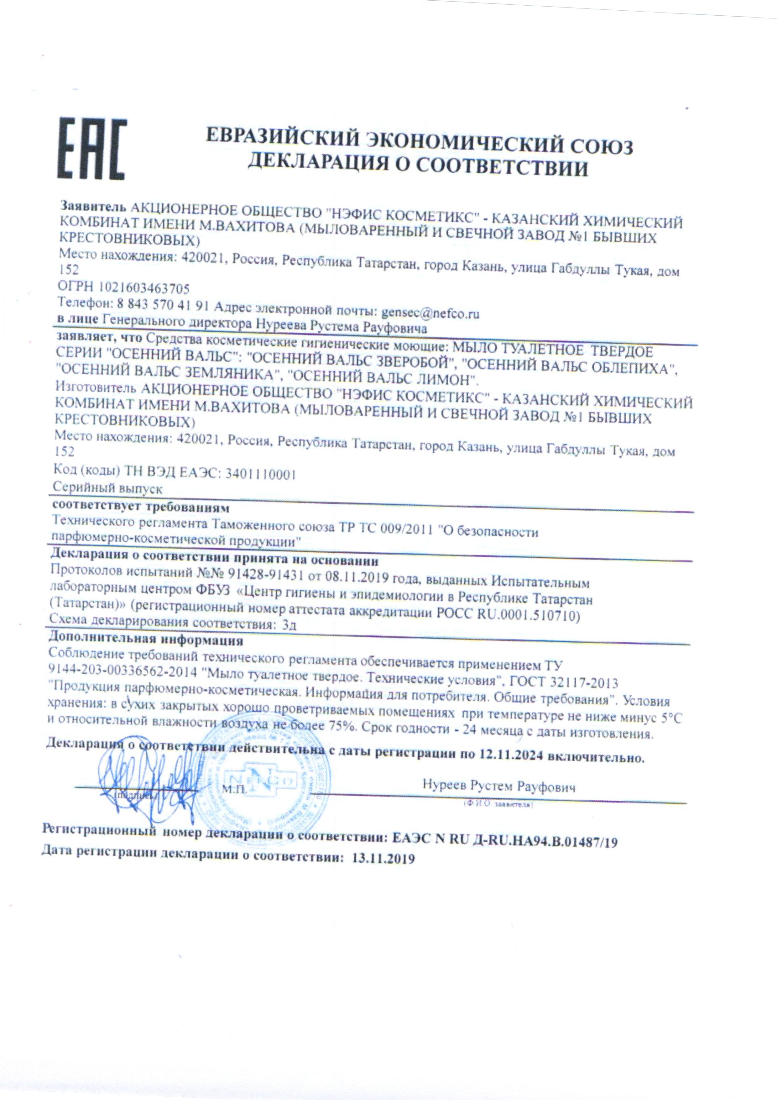 Состав: Натриевые соли натуральных жирных кислот, вода, глицерин, стабилизатор, пластификатор, парфюмерная композиция, хлорид натрия, CI 77891.