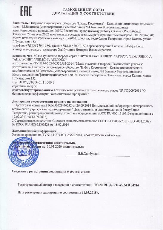 Натриевые соли натуральных жирных кислот, вода, глицерин, стабилизатор, пластификатор, парфюмерная композиция, хлорид натрия, CI 77891.