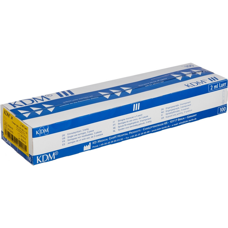 Шприц трехкомпонентный KD-Ject III 2 мл 23G (0.6x30 мм, 100 штук в упаковке). Предназначен для лекарственных инъекций. Игла упакована рядом со шприцем. Наличие уплотнительной манжеты с двумя кольцами, что обеспечивает более плавное, без рывков, движение поршня. Стопорное кольцо предупреждает случайное извлечение поршня из цилиндра. Точная контрастная черная градуировка нанесена на колбу. Абсолютно прозрачный цилиндр улучшает контроль содержимого шприца. Цилиндр изготовлен из высококачественного полипропилена. Поршень изготовлен из полиэтилена низкого давления. Каждый шприц имеет индивидуальную блистерную упаковку. Маркировка СЕ. Транспортная коробка - 3200 штук. Стерилизация - этиленоксид. На корпусе шприца несмываемая шкала с ценой деления 0,5 мл. Тип наконечника: Luer. Срок годности: 5 лет.