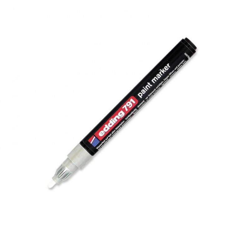 Экономичный универсальный маркер Edding 791 используется для промышленной непрозрачной маркировки практически всех материалов, например, стекла, пластика, дерева или металла. Может применяется для письма на жирных, пыльных, грязных поверхностях. Лаковый маркер устойчив к кислотам, растворителям, механическому истиранию, свету. Высококонцентрированный пигмент хорошо ложится на гладкие и шероховатые поверхности. Специальные добавки, введенные в состав маркера Edding E 791 растворяют, масляную пленку на поверхности письма. Непрозрачные лаковые чернила позволяют делать хорошо заметные надписи густым плотным слоем даже на темных поверхностях. Экономичный корпус промышленного маркера изготовлен из пластика. Маркер Edding E 791 имеет упроченный круглый (пулевидный) наконечник. Наконечник маркера может быть заменен по мере истирания. Благодаря тонкому наконечнику маркером может наносится маркировка на небольшие элементы и поверхности. Толщина линии — 1-2 мм. Поток чернил регулируется клапаном. Чернила маркера с лакирующим эффектом на основе нитрокраски. Водостойкий, быстро сохнет. Термостойкость надписи до 1000 градусов по Цельсию. Надписи цветами 05-010, 049 также видимы до 1000 градусов по Цельсию. Все остальные цвета термостойки до 400 градусов по Цельсию. Маркер Edding E 791 хорошо зарекомендовал себя в работе при перепадах температур от −15 до 30. Промышленный лаковый маркер Edding Е-791 универсален. Используется, например, при нанесении меток на разнородные материалы. При маркировке изделий из резины, пластика, стекла, металла, кабеля, проводов, при нанесении маркировки на товары достаточно одного маркера — Edding E 791. Идеально подходит для маркировки грузов, приборостроения, технологической маркировки. Кроме того, маркер Edding E 791, благодаря разнообразной палитре цветов и свойствам красящего вещества, широко используется для декоративных и оформительских работ дизайнерами. используется в витражных работах, росписи по дереву и керамике, для других интерьерных работ. Инструкция по применению маркера: 1. Перед использованием хорошенько встряхнуть с закрытым колпачком. 2. Снимите колпачок, прижмите наконечник к поверхности, надавите и удерживайте пока не проступит краска. 3. Применять после того как убедитесь, что вытекает исходный цвет. Предостережения: плотно закрывайте колпачок после применения, держать маркер вдали от огня и прямых солнечных лучей.