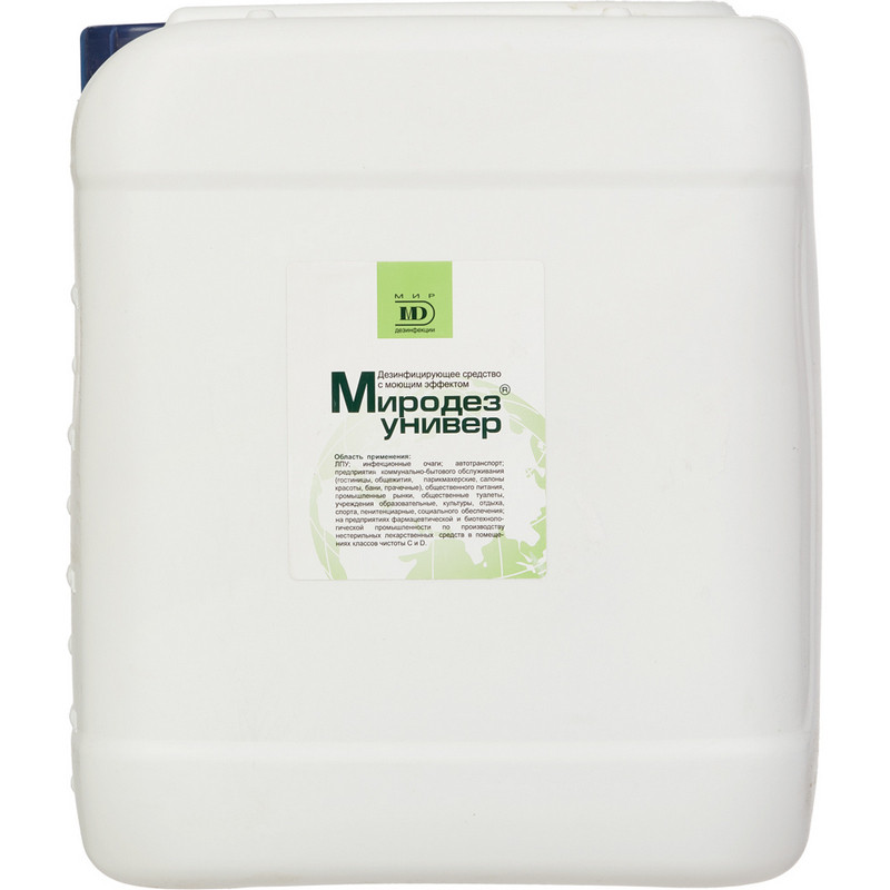 Дезинфицирующее средство 'Миродез Универ' 5 л (концентрат). Химический состав дезсредства: ЧАС, альдегид, вспомогательные компоненты. Действующие вещества: алкилдиметилбензиламмоний хлорид (АДБАХ) + дидецилдиметиламмоний хлорид 12 %, глиоксаль 5.7 %, вспомогательные компоненты. Сфера применения: ЛПУ, клинические лаборатории, станции переливания крови, бактериологические лаборатории, инфекционные очаги, предприятия общественного питания, предприятия продовольственной торговли, потребительские рынки, коммунальные объекты (бани, бассейны, гостиницы, общественные туалеты и т.п.), учреждения соцобеспечения, парикмахерские, косметические и (или) массажные салоны, прачечные, санитарный транспорт, отделения неонатологии, предприятия фармацевтической промышленности, учреждения культуры, отдыха (кинотеатры, музеи, театры), спортивные и культурно-оздоровительные комплексы, диагностические лаборатории. Объекты обработки: белье нательное, белье постельное, вращающиеся стоматологические инструменты, выделения больного (моча, фекалии, мокрота), гибкие эндоскопы, жесткая мебель, жесткие эндоскопы, игрушки, ИМН из металлов, резин на основе натурального и силиконового каучука, стекла, пластмасс, ИМН обычные, ИМН одноразовые перед утилизацией, инструменты к эндоскопам, инструменты стоматологические, инструменты хирургические, кровь, лабораторная посуда, медицинские отходы из текстильных материалов (ватные и марлевые тампоны, марля, бинты), мокрота, моча, мусороуборочное оборудование, мусоропроводы, обувь из пластика, резины, одноразовая посуда, пищевые отходы, поверхности в помещениях, поверхности приборов и аппаратов, предметы для мытья посуды, предметы личной гигиены, предметы ухода за больными, рвотные массы, резиновые и полипропиленовые коврики, санитарно-техническое оборудование, санитарный транспорт, слюноотсосы, столовая посуда, стоматологические материалы (оттиски из альгината, силикона, полиэфирной смолы, зубопротезные заготовки, артикуляторы), транспорт для перевозки пищевых продуктов, уборочный инвентарь, фекалии. Основные режимы применения средства (концентрация/время): дезинфекция поверхностей по бактериям, исключая туберкулез (0.01 %/120 мин., 0.05 %/60 мин., 0.1 %/30 мин., 0.2 %/15 мин., 0.5 %/5 мин.), дезинфекция поверхностей по вирусным инфекциям (0.1 %/60 мин., 0.25 %/30 мин., 0.5 %/15 мин.), дезинфекция поверхностей по кандидозу (0.1 %/60 мин., 0.25 %/30 мин., 0.5 %/15 мин.), дезинфекция поверхностей по дерматофитам (0.1 %/60 мин., 0.25 %/30 мин., 0.5 %/15 мин.), дезинфекция поверхностей по туберкулезу (0.5 %/60 мин., 1 %/30 мин.), дезинфекция ИМН при бактериальных, вирусных инфекциях и кандидозе (0.2 %/60 мин., 0.4 %/30 мин.), дезинфекция, совмещенная с ПСО ИМН при бактериальных, вирусных инфекциях и кандидозе (0.2 %/60 мин., 0.4 %/30 мин.), дезинфекция крови (0.5 %/90 мин., 1 %/60 мин., 2 %/30 мин.), дезинфекция мокроты (0.5 %/90 мин., 1 %/60 мин., 2 %/30 мин.), дезинфекция фекалий (0.5 %/90 мин., 1 %/60 мин., 2 %/30 мин.). Класс опасности: при введении в желудок - 3; при нанесении на кожу - 4; рабочего раствора - 4. Активно в отношении: бактерии (Mycobacterium tuberculosi, грамотрицательные бактерии, грамположительные бактерии), вирусы (аденовирусы, атипичной пневмонии, ВИЧ, герпеса, грипп, парагрипп, парентеральных гепатитов, полиомиелит, прочие возбудители ОРВИ, птичьего гриппа (H5N1), ротавирусы, энтеральных гепатитов, энтеровирусы), патогенные грибы (дерматофит