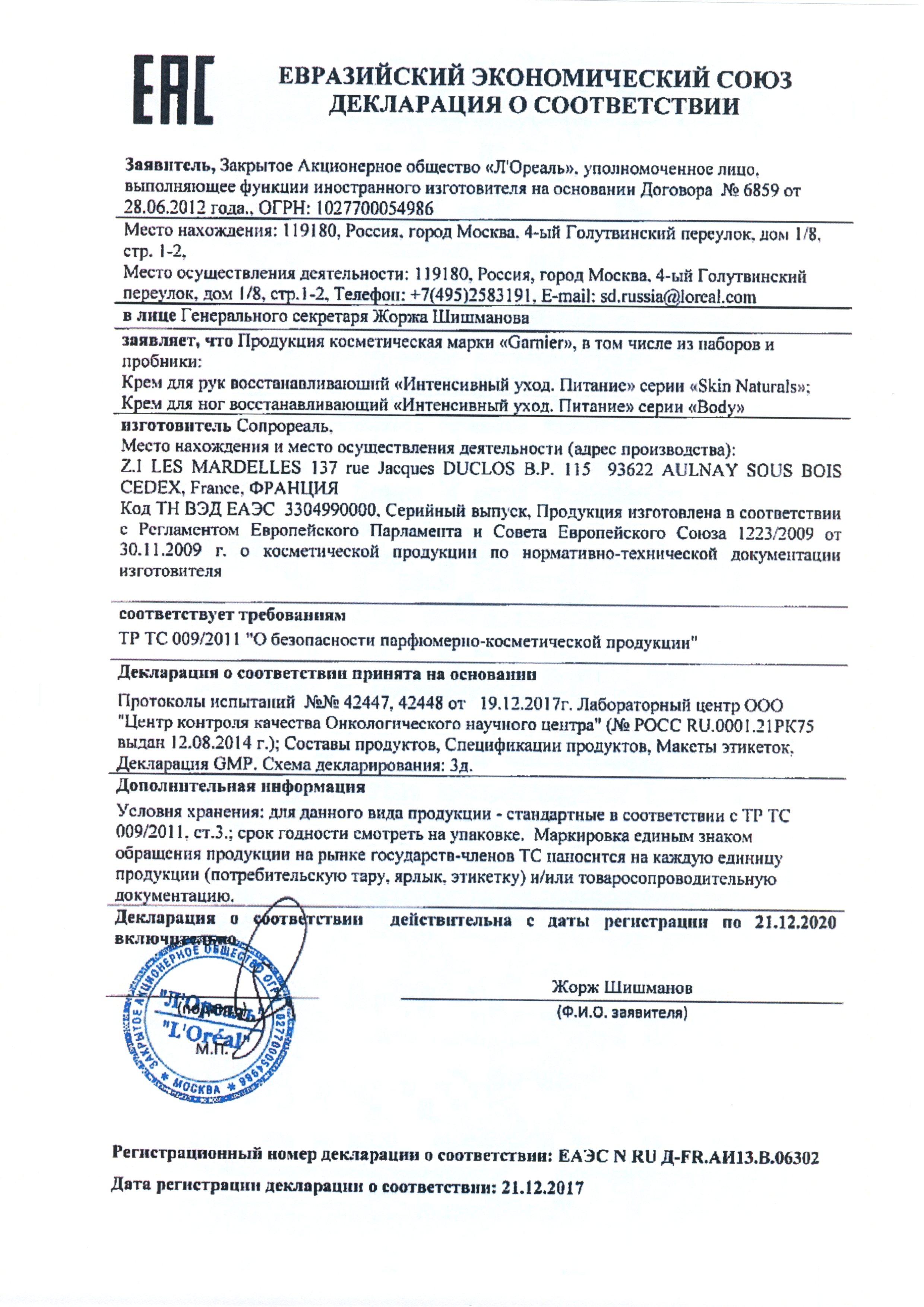 Сертификат на товар - Крем для рук Garnier Интенсивный уход восстанавливающий для очень сухой кожи 100 мл