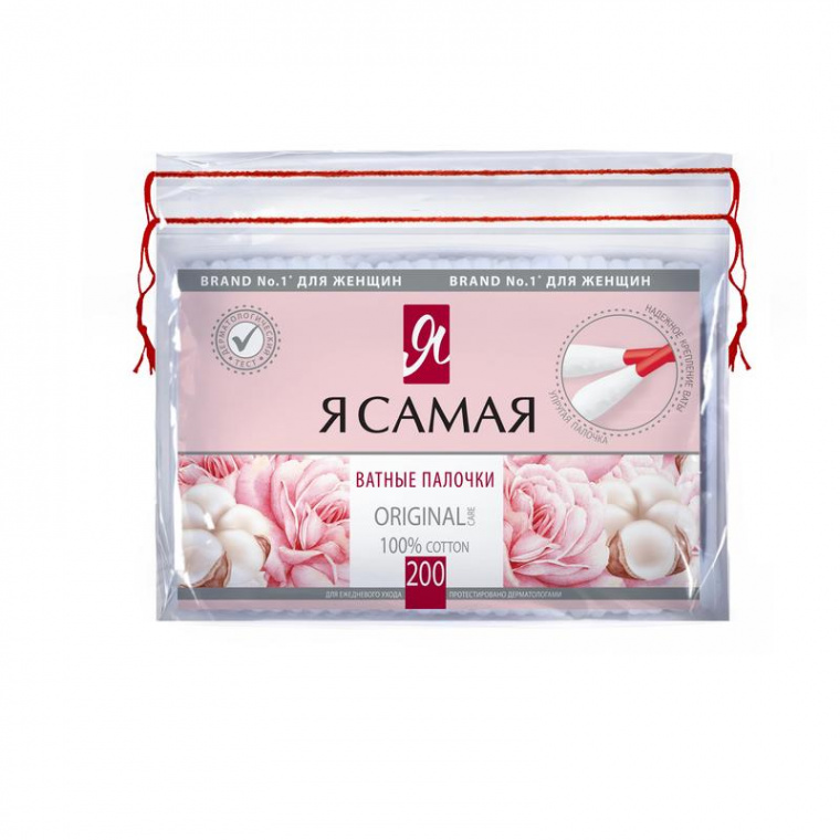 Палочки ватные «Я самая» изготовлены из стопроцентного хлопка. Изделия применяются для косметических и гигиенических целей. Мягкие белые ватные подушечки, имеющие классическую форму, аккуратно намотаны на пластиковые палочки, имеющие длину 75 мм. Изделия облегчают нанесение макияжа и гигиенический уход за детьми. Ватные палочки поставляются в прозрачном полиэтиленовом