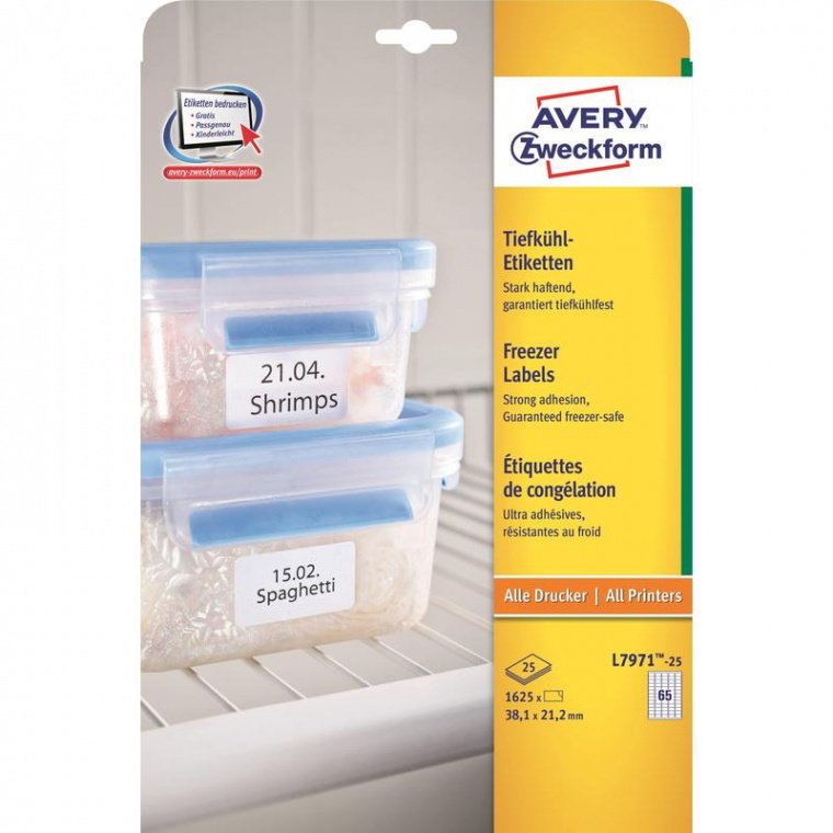 Морозостойкие самоклеящиеся этикетки Avery Zweckform оптимальны для маркировки при низкой температуре. Устойчивы к температурам от −50 до +70 градусов Цельсия. Специальный клеевой состав пригоден для использования на сухих нежирных поверхностях, материалах с волнистой или неровной поверхностью, а также на слегка замороженных поверхностях. Размер — 38,1×21,2 мм, цвет белый. В упаковке 1625 этикеток (25 листов по 65 штук). Предназначены для печати на лазерных и струйных принтерах.