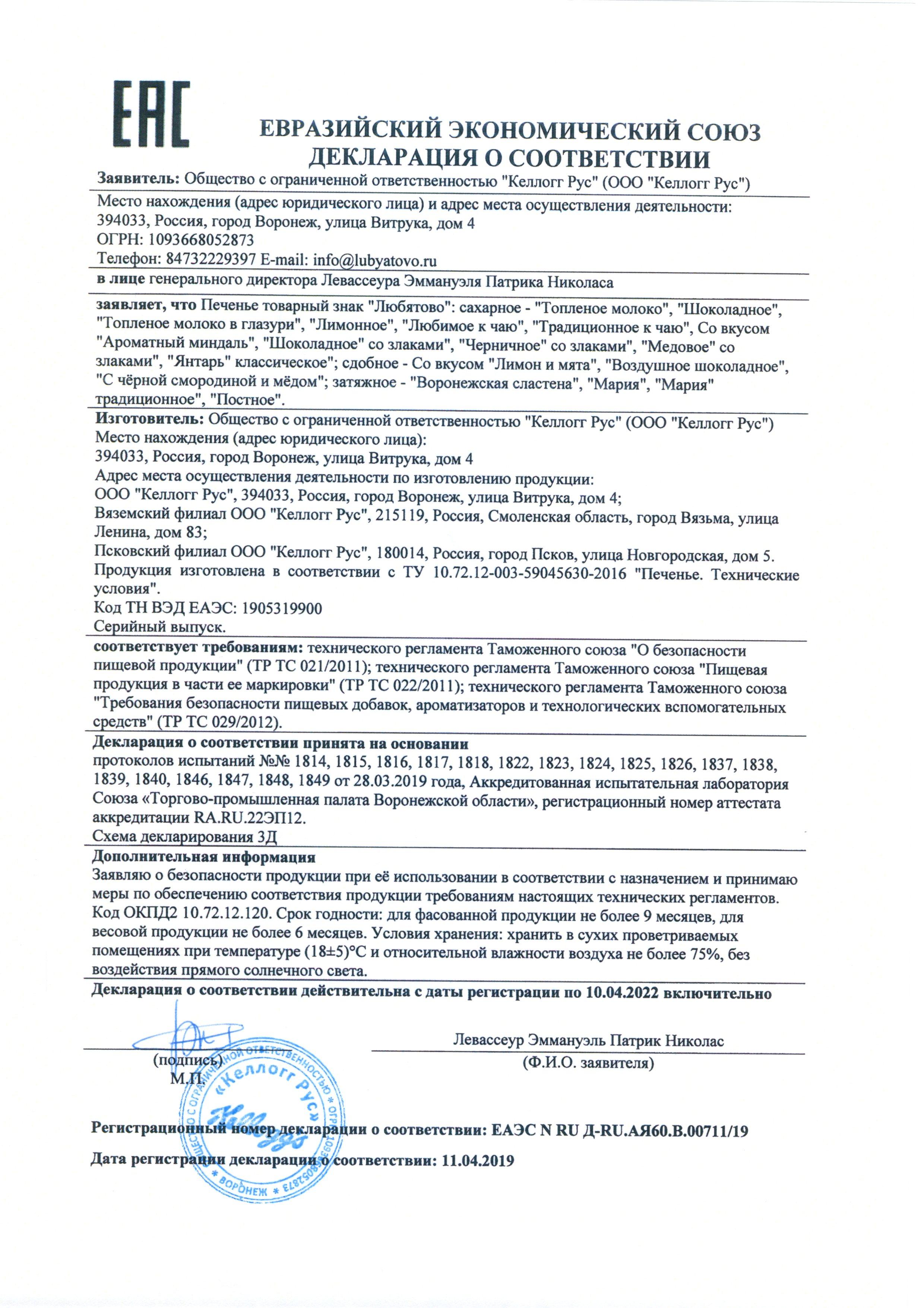 Состав: мука пшеничная, масло растительное, сахар, сироп инвертный (сахар, регуляторы кислотности, кислота молочная, натрий двууглекислый), крахмал, кукурузный, молоко цельное сгущенное с сахаром, меланж яичный сухой, соль поваренная пищевая, разрыхлители: соль углеаммонийная, натрий двууглекислый (сода пищевая), эмульгатор — лецитин, ароматизатор идентичный натуральному топленое молоко, молоко коровье топленое. Продукт содержит молочный белок, яйца, глютен пшеницы, сою.