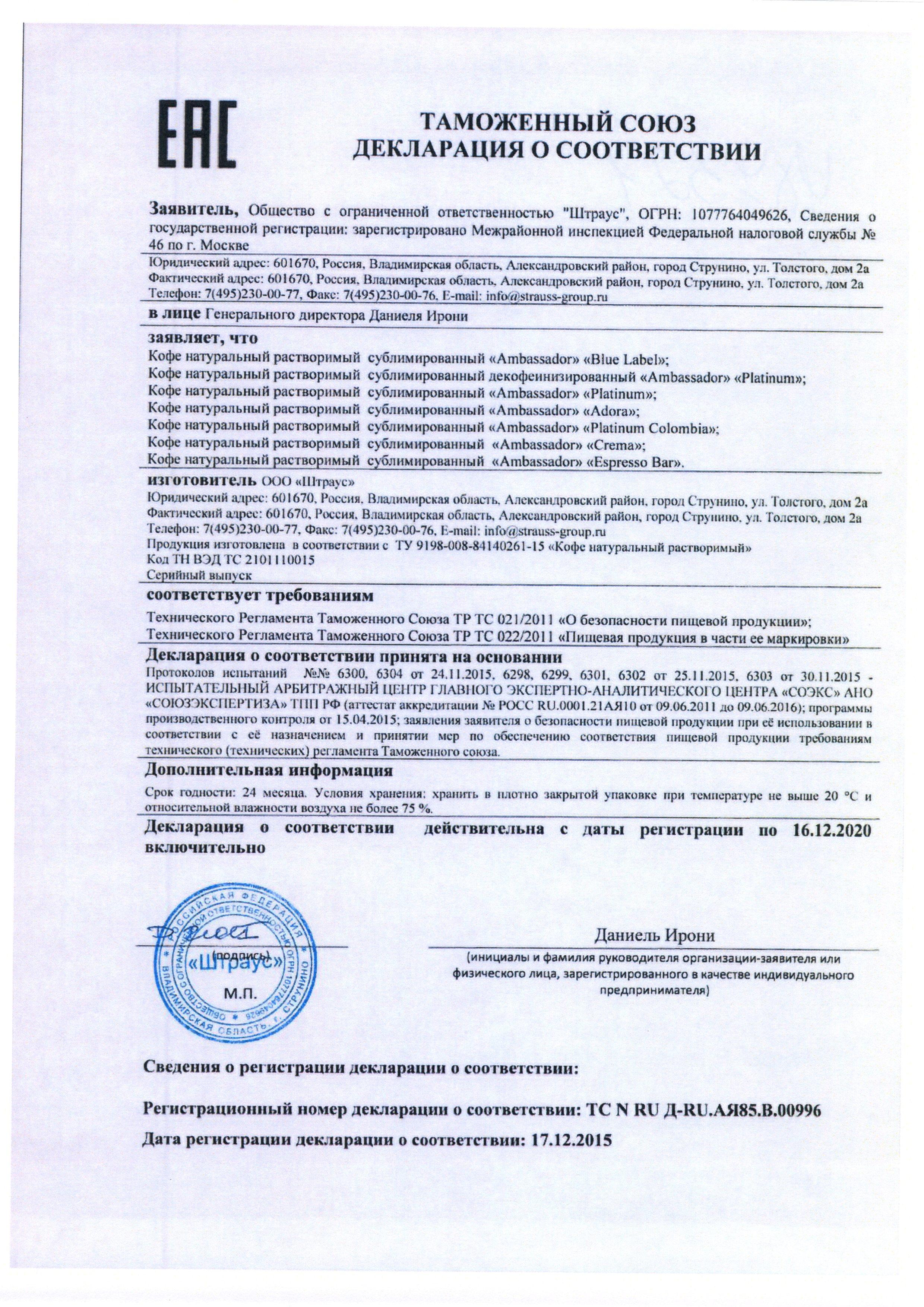 Растворимый сублимированный Ambassador Platinum один из наиболее удобных вариантов для приготовления. Так как это растворимый напиток, вы всегда сможете взять его с собой как на работу, так и в поездки. Достаточно просто заварить 1-2 чайные ложки кофе горячей водой и напиток готов. Прекрасно проявляет себя в сочетании с различными добавлениями. Мягкая вакуумная упаковка не заставит переживать о сохранности продукта, не разобьется и не создаст дополнительной тяжести. Доверьте свой день кофе Ambassador и он подарит вам массу положительных моментов.