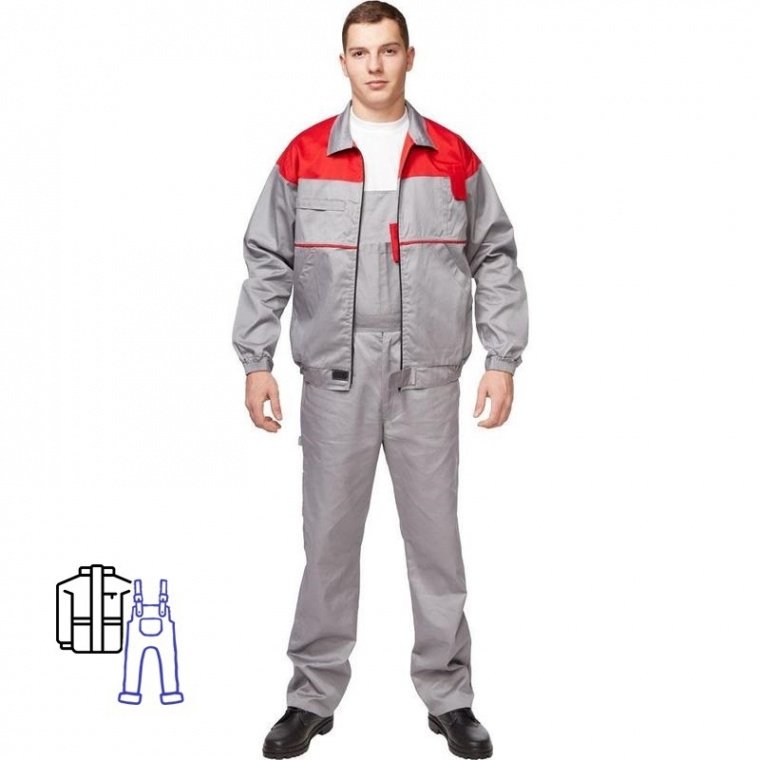 Спецодежда летняя костюм мужской «Универсал» состоит из куртки и полукомбинезона (размер 64-66, рост 170-176) серого цвета с красными вставками на куртке. Изготовлен из смесовой ткани (65% полиэстер, 35% хлопок) плотностью 220 г/кв.м. Куртка с центральной застежкой на молнию и поясом на эластичной ленте. Оснащена двумя боковыми накладными карманами и верхним карманом для средств связи. Полукомбинезон имеет нагрудный, задний и боковые карманы. Костюм обеспечивает защиту от производственных загрязнений. ГОСТ 27575-87.