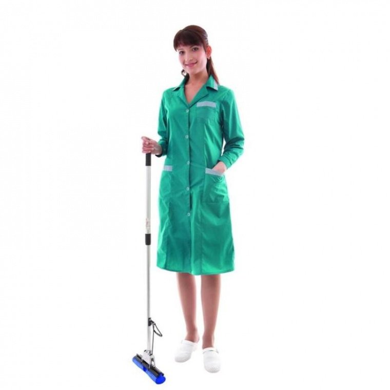 Женский халат для горничных и уборщиц у01-ХЛ размер 64-66, рост 158-164 см. Изготовлен из смесовой ткани Ти-Си, цвет бирюзовый (сине-зеленый), состав — 65% полиэфира и 35% хлопка. Ти-Си — материал, приятный на ощупь, гигиеничен и долговечен. Не мнется, легко и быстро стирается, быстро сохнет. Долго сохраняет свой первоначальный яркий цвет. Ткань «дышит», благодаря входящему в состав хлопку, имеет повышенный срок службы и проста в уходе, благодаря полиэфиру. Рукав длинный. Воротник отложной с лацканами, есть накладные карманы. Отлет воротника, верхние части карманов и края рукавов отделаны светлой тканью. Халат застегивается на пуговицы. Униформа рекомендована для сферы обслуживания, клининга, гостиничного бизнеса.