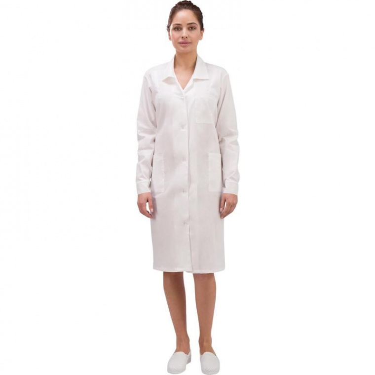 Халат рабочий женский предназначен для защиты от общих промышленных загрязнений и механических воздействий кожи и одежды. Халат рабочий женский востребован в разных отраслях промышленности, начиная от маляров и заканчивая инженерами и строителями. Белый женский рабочий халат классического прямого покроя длиной по колено, застегивается спереди на пуговицы. Воротник — отложной. Имеет длинные рукава с манжетами на манжете. 2 кармана спереди для мелочей. Изделие, предназначено для использования в летний сезон, выполнено из гладкокрашенной бязи (100 хлопка плотностью 142 г/кв.м.). Высокопрочная, экологичная, гигроскопичная ткань изготовлена в соответствии с ГОСТом. Халат белого цвета 64–66 размера рассчитан на рост 170–176 см. Температурный режим стирки — не выше 40 градусов.