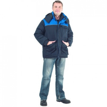 Спецодежда зимняя куртка мужская з08-КУ (размер 64-66, рост 170-176) синего цвета с васильковыми вставками. Изготовлена из смесовой ткани с водоотталкивающей пропиткой (68% полиэфир, 32% хлопок), плотность ткани - 220 г/кв.м. Утеплитель - синтепон, плотность - 200 г/кв.м (2 слоя). Материал подкладки - 100% полиэстер. Куртка с центральной застежкой на молнию, ветрозащитным клапаном. Кокетка полочек и спина отделаны тканью со светоотражающим кантом. На куртке есть два накладных кармана и отстегивающийся капюшон. Куртка обеспечивает защиту от пониженных температур и производственных загрязнений. Рекомендована для использования в сельском хозяйстве, логистике, легкой промышленности, строительстве. ГОСТ 12. 4. 303-2016. Коллекция зимней спецодежды з08 представлена в нескольких цветовых сочетаниях: синий с яркими элементами василькового цвета и и синий с контрастной красной отделкой.