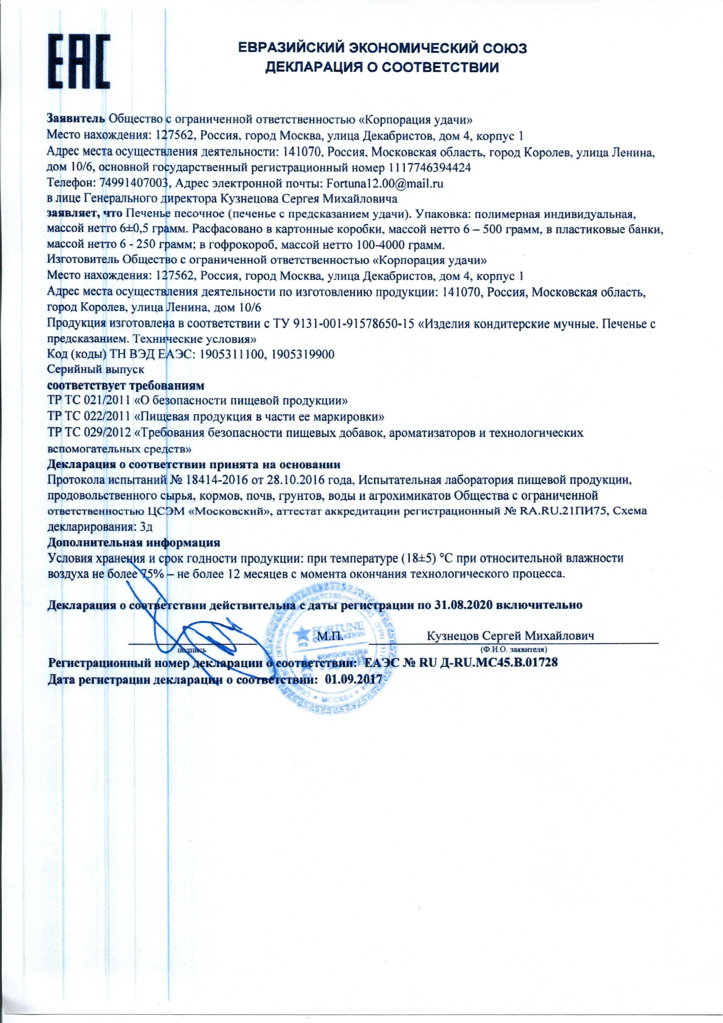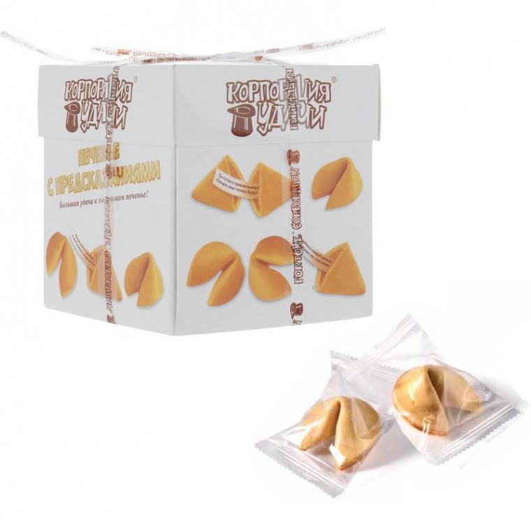 Печенье с предсказаниями — волшебное печенье, в котором, лежит записка с сюрпризом, предсказанием счастья, любви и богатства. С помощью этих печений легко устроить праздник, прекрасно поднять настроение и подарить улыбки коллегам, друзьям и близким. Надломите печенье, достаньте листик и узнайте, какое предсказание выпало вам, сохраните это в тайне или расскажите друзьям. Насладитесь замечательным вкусом ароматного печенья и будьте счастливы! Поставляется в красочной картонной упаковке, в которой находятся 5 печений. Внутри каждое печенье в отдельной упаковке.