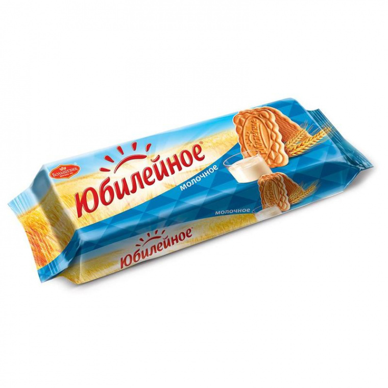 Румяное молочное печенье «Юбилейное» сложено в герметичную упаковку с узнаваемым дизайном. Она отлично сохраняет свежесть печенья, которое остается на следующий день.