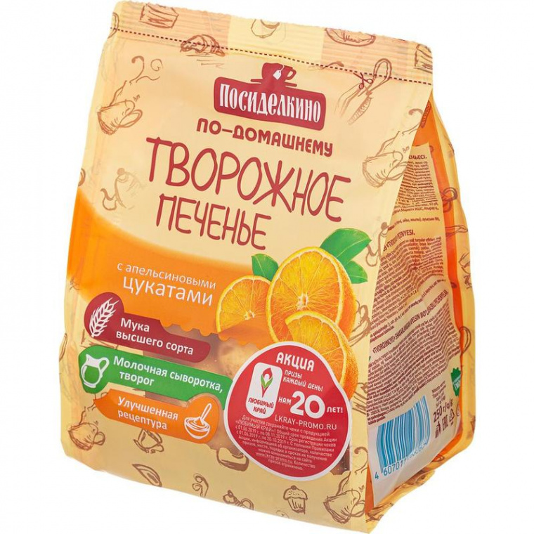 Герметичная упаковка с ярким оформлением надежно сохраняет свежесть и аромат творожного печенья с апельсиновыми цукатами, чтоб вы каждый раз наслаждались этим чудесным лакомством и заряжались только позитивными эмоциями.
