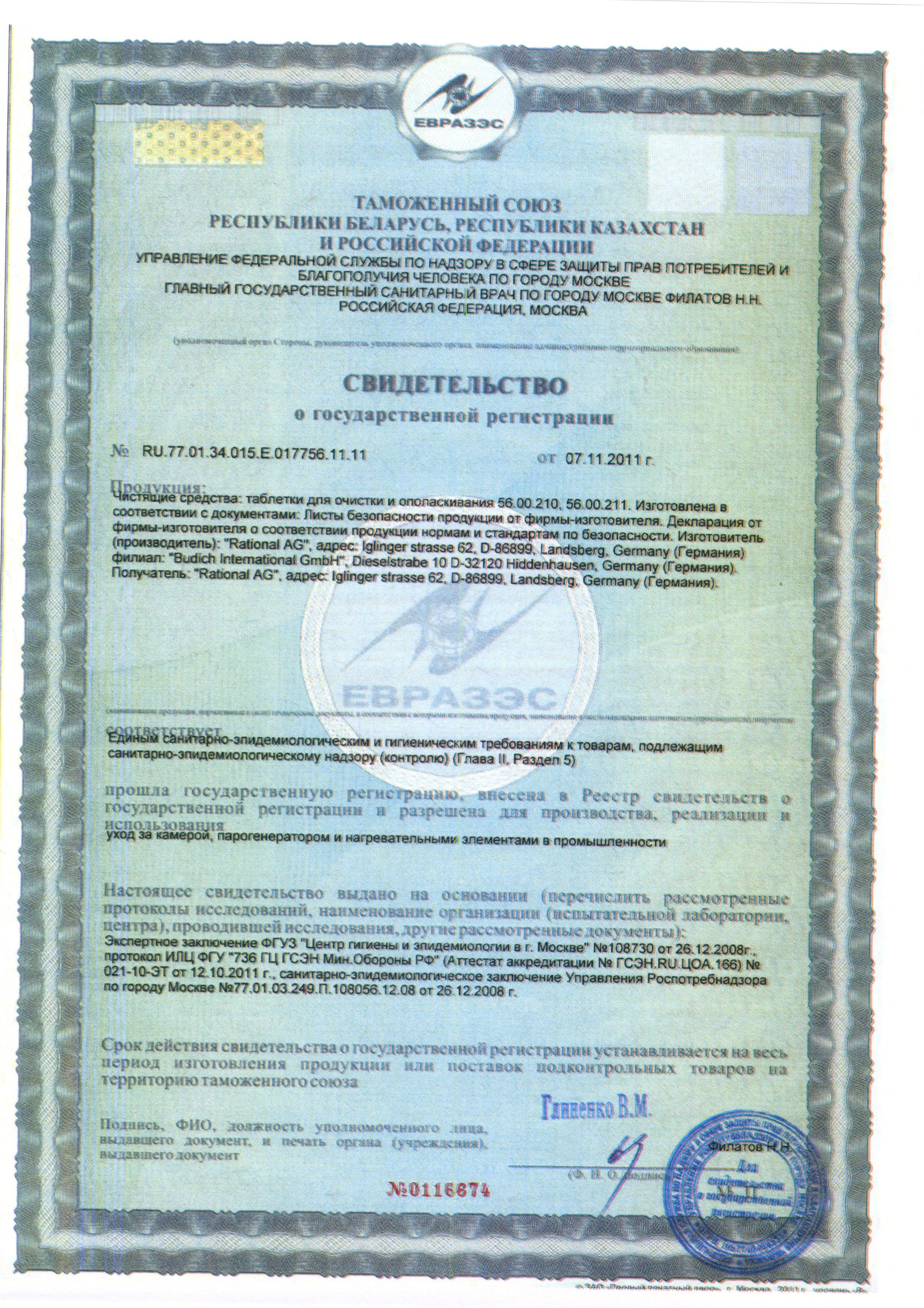Сертификат на товар - Очищающие таблетки Rational для аппаратов серии SСC (100 таблеток в упаковке)