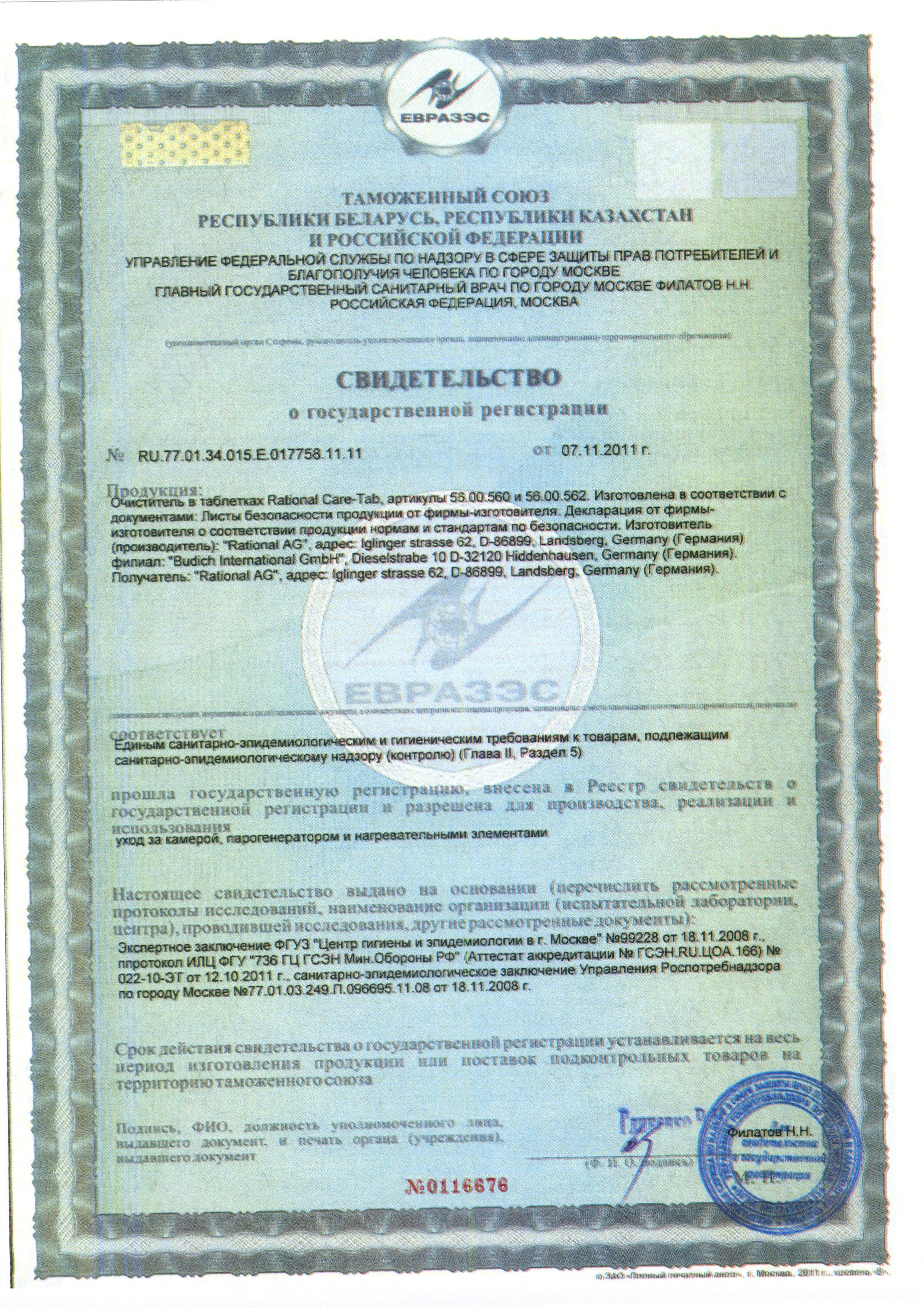 Сертификат на товар - Таблетки Care-Tab RATIONAL для аппаратов серии SCC (150 таблеток в упаковке)