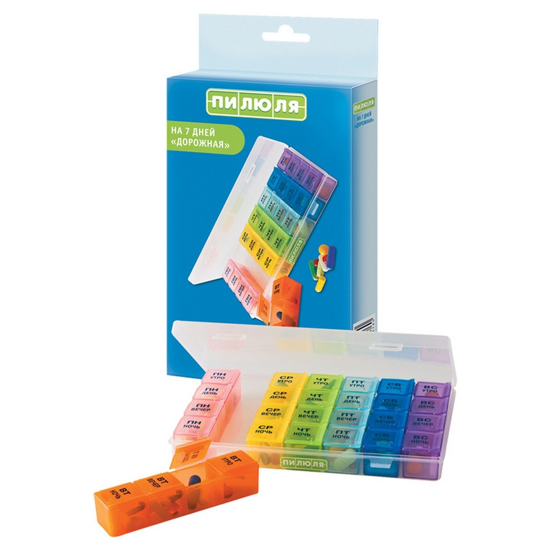 Таблетницы предназначены для компактного и упорядоченного хранения медицинских препаратов или витаминов. - Изготовлены из безопасного, легко моющегося пластика. - Удобные и простые в использовании. - Легко помещаются и переносятся в сумке.Описание: Содержит 7 отдельных контейнеров, которые соответствуют дням недели: ПН, ВТ, СР, ЧТ, ПТ, СБ и ВС. Каждый контейнер состоит из 4 отделений для распределения медицинских препаратов в соответствии с суточным режимом приема: утро, день, вечер и ночь. Для людей с ослабленным зрением нанесены символы Брайля. Способ применения: Откройте верхнюю прозрачную крышку таблетницы; откройте крышки контейнеров; разложите медицинские препараты или витамины по отделениям в соответствии с днем недели и временем суток; закройте крышки контейнеров; закройте верхнюю крышку таблетницы. Размер контейнера 17,5х10,5см, Размер таблетниц 2,5х10см.