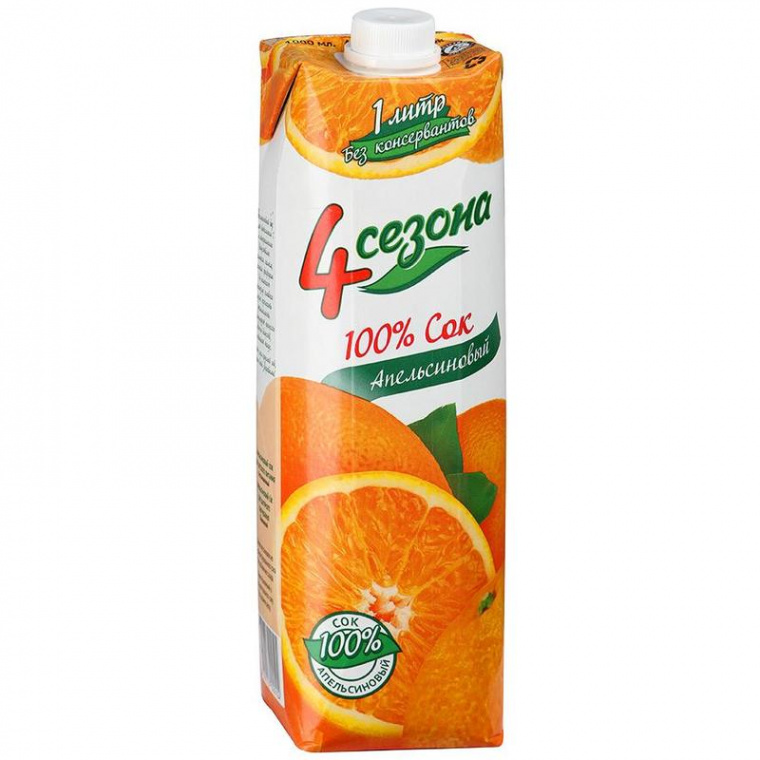 Сок 4 Сезона апельсин 1 л. Апельсиновый сок для детского питания восстановленный. Без консервантов. 100% сок.