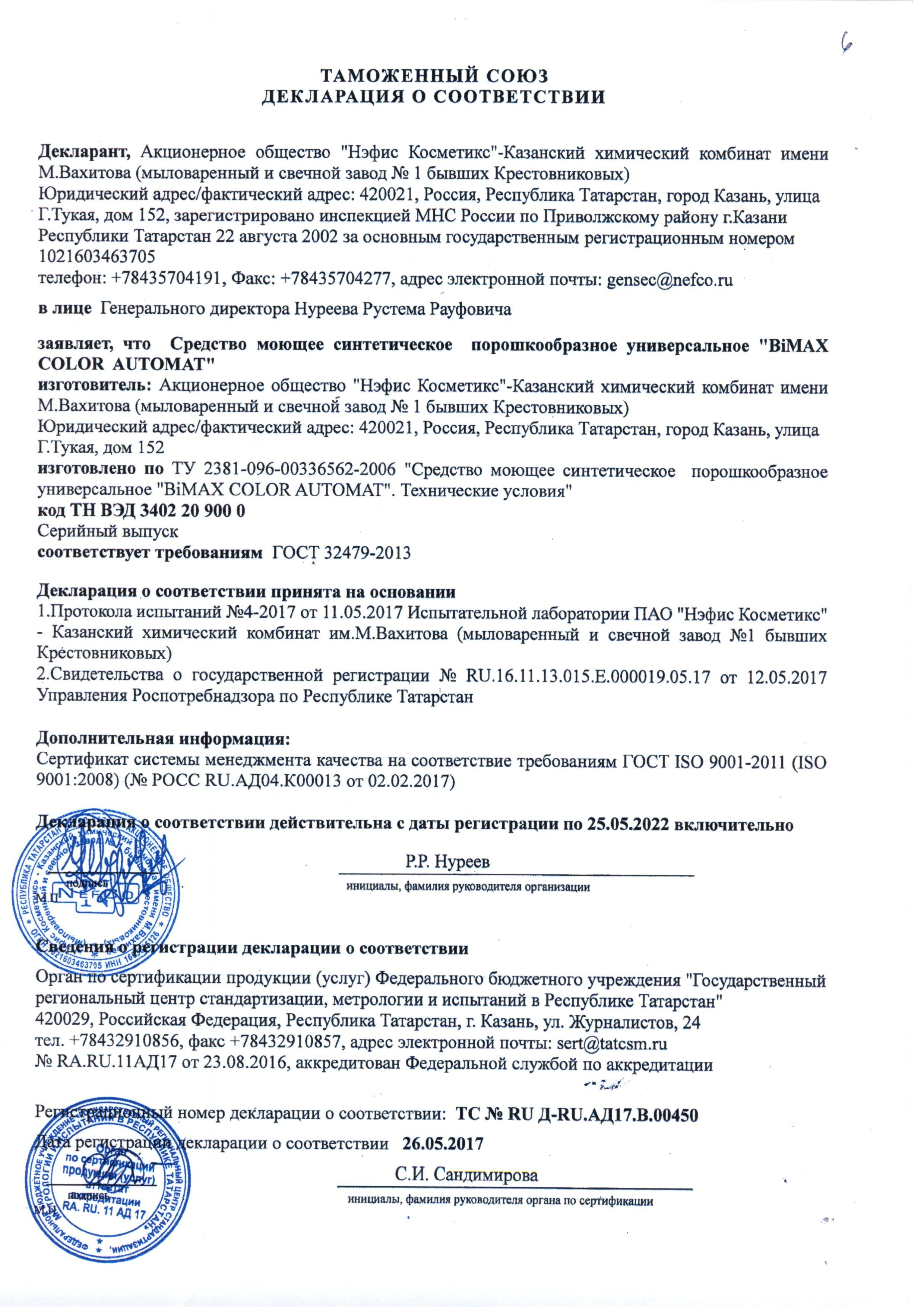 Сертификат на товар - Порошок стиральный автомат BiMax Color 6 кг