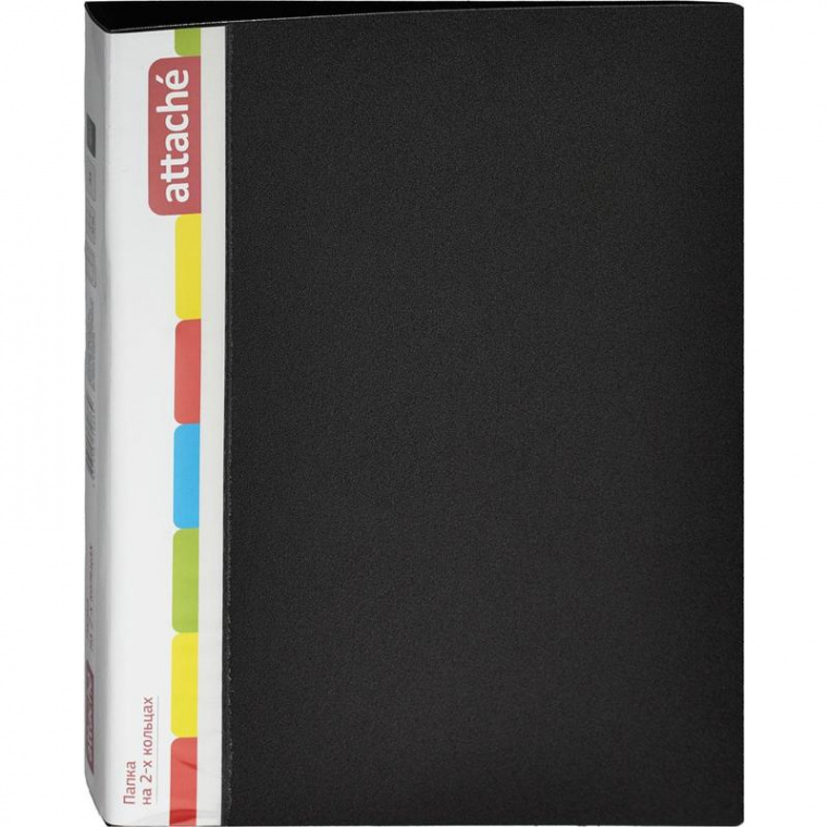 Папка на двух кольцах Attache изготовлена из пластика толщиной 0,7 мм черного цвета. Формат А4. Снабжена механизмом на двух O-кольцах. Диаметр кольца — 17 мм. На внутренней стороне обложки есть прозрачный карман для документов. Ширина корешка составляет 32 мм. Папка на кольцах вмещает до 150 листов стандартной плотности.