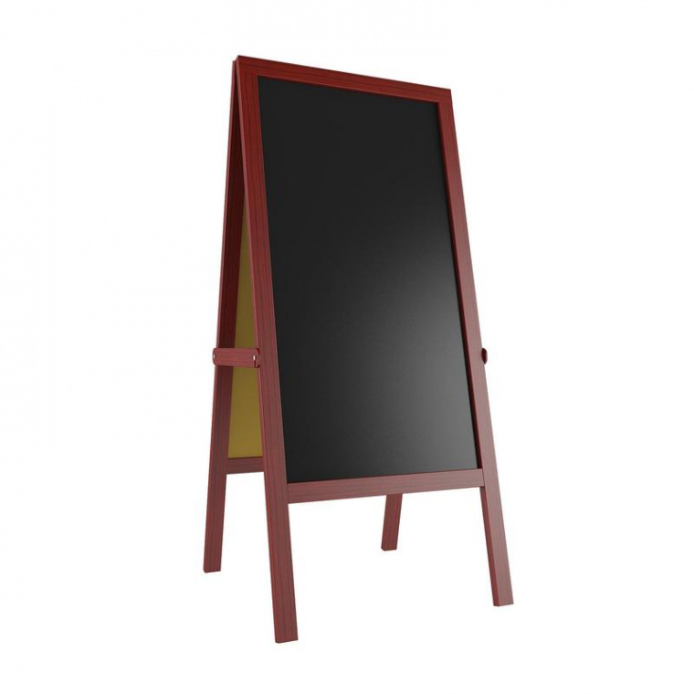 Штендер. Каркас — деревянный багет шириной 40 мм, окрашенный в темно-коричневый цвет, основание — оргалит, рабочая поверхность размером 480×900 — металлический лист с лаковым покрытием чёрного цвета, упаковка — картонная коробка. Ножки 300 мм, размеры доски с учетом ножек и рамки — 560×1240 мм. Стойка двухсторонняя (две рабочие поверхности). Стойку рекомендуется использовать в помещении.