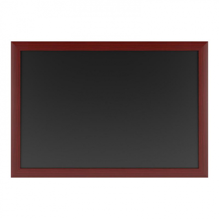 Доска магнитно-меловая. Основание ДВП, рабочая поверхность — металлический лист с лаковым покрытием черного цвета. Размер рабочей поверхности доски 600×900 мм. Улучшенная рама из деревянного багета темно-коричневого цвета шириной 45 мм. Качественная обработка дерева, без сколов и сучков. Доска предназначена для нанесения информации мелом, а также позволяет крепить бумажные листы при помощи магнитов. Надписи, нанесенные мелом, удаляются при помощи влажной салфетки. Крепление к стене открытого типа, на двух подвесах. Набор для крепления доски к стене входит в комплект. Упаковка — картонная коробка. Полочка для мела, в комплекте отсутствует.
