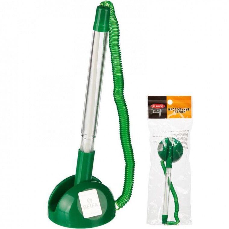 Шариковая ручка Beifa в подставке с синим цветом чернил. Модель представлена в корпусе прозрачного цвета с деталями зеленого цвета, выполненном из пластика. Изделие прикреплено к подставке с помощью резинового шнура-пружины. Длина пружины ручки в ненатянутом состоянии 14 см, в натянутом — 133 см. Благодаря липкому слою на основании подставка может быть жестко зафиксирована практически на любой ровной поверхности. Диаметр подставки — 45 мм, высота — 27 мм. При письме стержень, оснащенный шариком, оставляет линию, толщина которой составляет 0,5 мм. Возможна замена стержня. Дополнительные стержни для ручки вы сможете найти во вкладке «Расходные материалы». Удобна для использования в офисах и различных учреждениях.