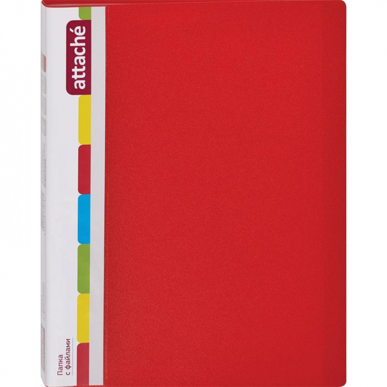 Файловая папка Attache формата А4 изготовлена из пластика (0,7 мм) красного цвета. Имеет 20 несъемных прозрачных вкладышей для удобного хранения и демонстрации документов. Ширина корешка составляет 15 мм. На корешке — карман для сменной этикетки. Папка с файлами вмещает до 40 листов (по два листа в каждом). Плотность файлов 25 мкм.