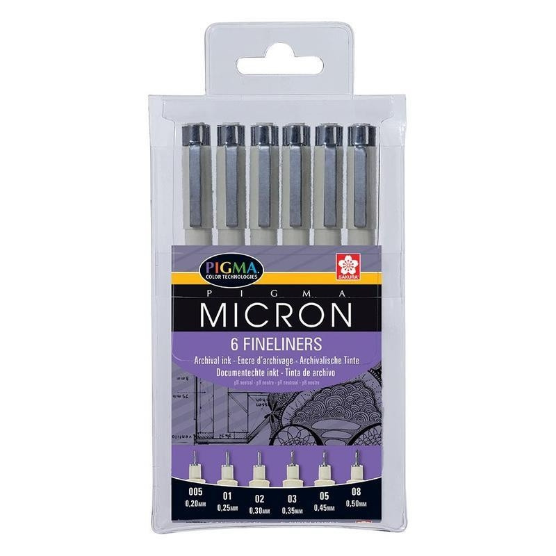 Набор линеров Pigma Micron. Универсальные капиллярные ручки для письма, создания скетчей, иллюстраций, чертежей, ведения дневниковых, архивных записей и журналов наблюдений. Во всем мире ручки c чернилами Pigma используют архитекторы, дизайнеры, художники, иллюстраторы, каллиграфы, любители скрапбукинга и аниматоры. Все ручки Pigma имеют маркировку AP (Approved Product) института ACMI, что означает отсутствие в составе чернил вредных веществ. Уникальные запатентованные архивные чернила Pigma ink обеспечивают насыщенный черный цвет, влагостойкость и устойчивость к выцветанию (работы, сделанные этими чернилами, могут храниться до 100 лет). Чернила быстро сохнут, не смазываются и не протекают на обратную сторону даже очень тонкого листа на большинстве типов бумаги. Чернила PH-нейтральны и не повреждают бумагу при долгосрочном хранении. Набор из 6 линеров разной толщины письма: 0.2мм; 0.25мм, 0.3мм, 0.35мм, 0.45мм и 0.5мм в ПВХ-пенале. Сделано в Японии.