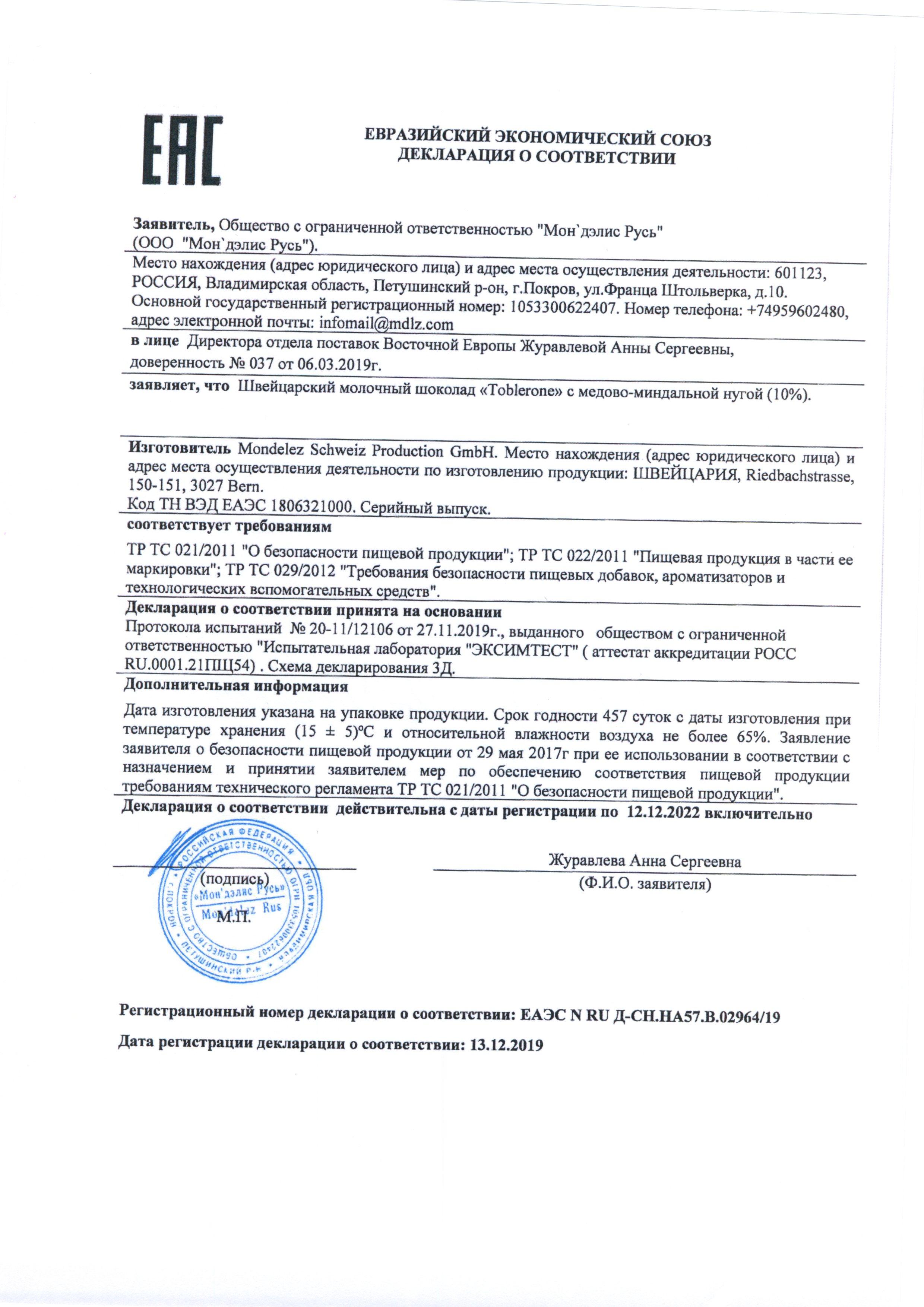Сертификат на товар - Шоколад Toblerone молочный с нугой 100 г
