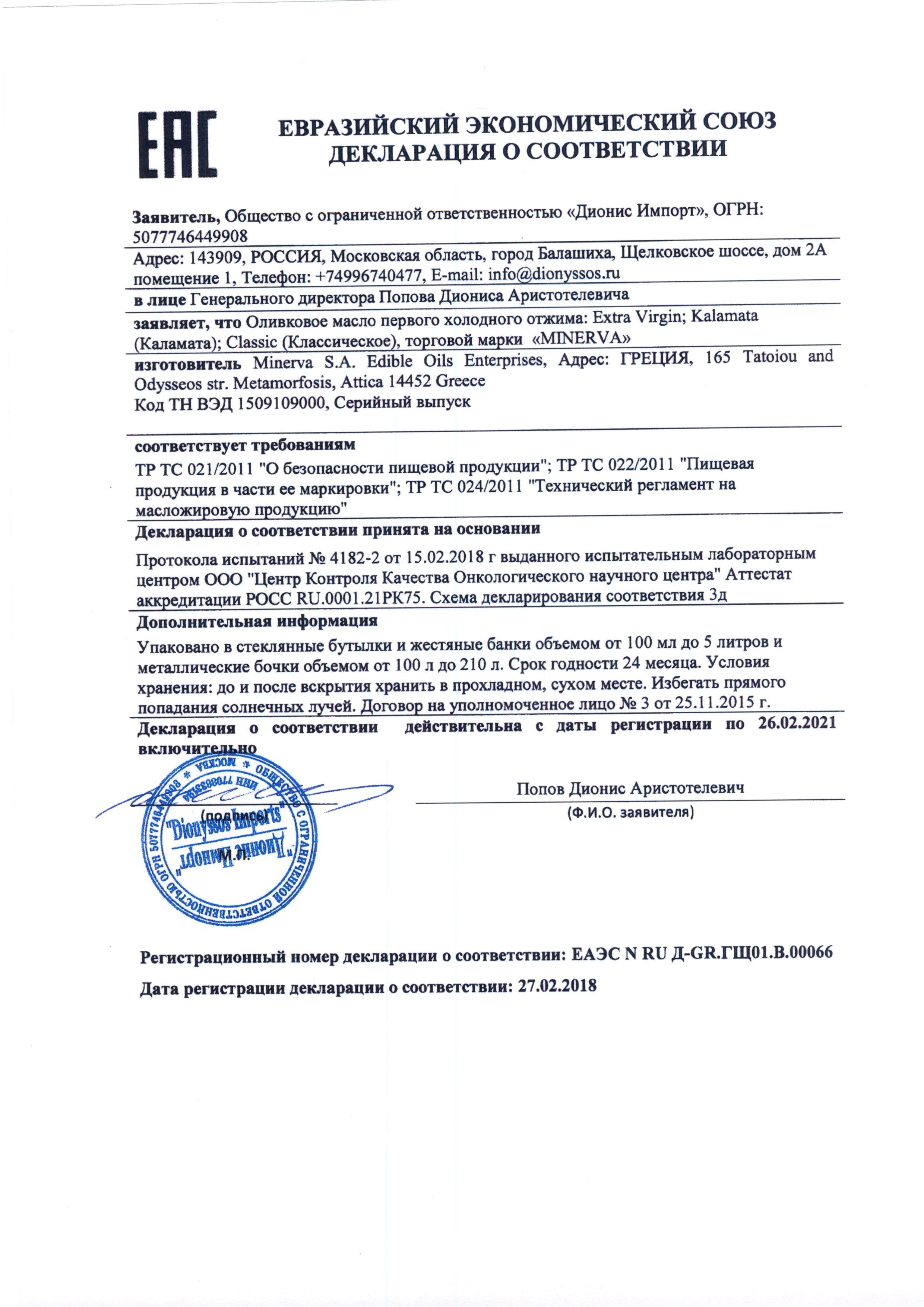 У натурального продукта приятный легкий аромат, нежная текстура, насыщенный мягкий вкус — характерная горчинка едва ощущается. Содержание олеиновой кислоты — менее 1 %. Масло Minerva Greek Extra Virgin Kalamata применимо в кулинарии: для приготовления блюд, как приправа. Оно подходит и для употребления в чистом виде.