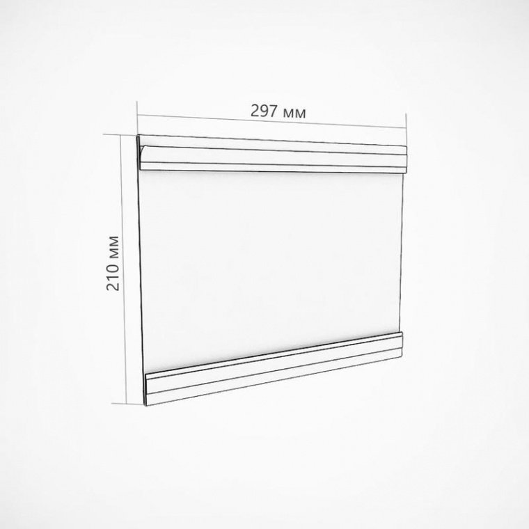 Держатель для информации с двумя загибами. Фиксируется на двух полосках магнитного скотча, размещенных на тыльной стороне кармана. Формат А4, горизонтальное расположение. Материал ПЭТ. 0,3 мм