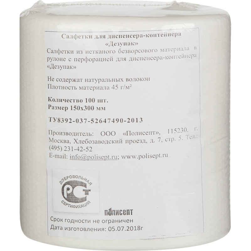 Безворсовая салфетка из нетканного материала без содержания натуральных волокон, прекрасно сохраняющая форму, устойчивая к разрыву. Плотность - 45 г/м.кв. Полное удаление видимых загрязнений. Площадь обеззараживания поверхности - не менее 1,8 м. Экономичный расход рабочего раствора - 1,8 л на 100 салфеток, 2,7 л на 150 салфеток. Быстрое впитывание рабочего раствора - время до начала работы не более 10 минут. Материал салфеток полностью совместим с рабочими растворами дезинфицирующих средств производства ООО 'Полисепт' и ООО 'Мир дезинфекции'. Назначение: профессиональная уборка (мытье, очистка) и дезинфекция способом протирания поверхностей в помещении, включая предметы обстановки, медицинские приборы, аппаратуру, оборудование и прочие объекты, рабочими растворами дезинфицирующих средств, в лечебно-профилактических организациях различного профиля, клинических, микробиологических лабораториях, машинах скорой медицинской помощи и служб ГО и ЧС, на санитарном транспорте, станциях переливания крови, в инфекционных очагах, зонах чрезвычайных ситуаций; в детских образовательных, социальных и пенитенциарных учреждениях, на предприятиях общественного питания и торговли, рынках, коммунально-бытовых объектах (офисы, парикмахерские, солярии, гостиницы, общежития, сауны, салоны красоты, учреждения спортивно-оздоровительного назначения, включая фитнес центры, бассейны, аквапарки и другие); на предприятиях химико-фармацевтической и биотехнологической, пищевой промышленности, всех видах транспорта и других объектах. Сменный блок. Количество в упаковке: 100 штук.