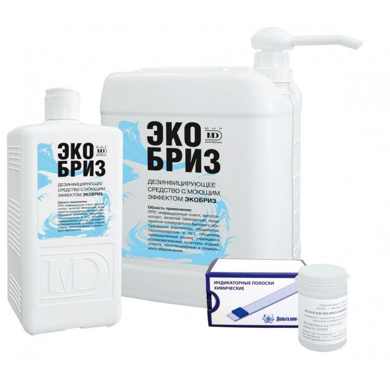 Дезинфицирующее средство 'Экобриз' 5 л (концентрат). Химический состав дезсредства: ЧАС, третичный амин, вспомогательные компоненты. Действующие вещества: N,N-бис(3-аминопропил)додециламин 2.3 %, алкилдиметилбензиламмоний хлорид (АДБАХ) + дидецилдиметиламмоний хлорид 1.8 %, вспомогательные компоненты. Сфера применения: ЛПУ, клинические лаборатории, бактериологические лаборатории, детские учреждения (детсады, школы и т.п.), инфекционные очаги, предприятия общественного питания, коммунальные объекты (бани, бассейны, гостиницы, общественные туалеты и т.п.), учреждения соцобеспечения, парикмахерские, косметические и (или) массажные салоны, прачечные, санитарный транспорт, учреждения культуры, отдыха (кинотеатры, музеи, театры), спортивные и культурно-оздоровительные комплексы. Объекты обработки: аппараты искусственной вентиляции легких, белье нательное, белье постельное, гибкие эндоскопы, жесткая мебель, жесткие эндоскопы, игрушки, ИМН из металлов, резин на основе натурального и силиконового каучука, стекла, пластмасс, ИМН обычные, ИМН одноразовые перед утилизацией, инструменты к эндоскопам, инструменты парикмахерских, массажных, косметических салонов, инструменты стоматологические, инструменты хирургические, лабораторная посуда, мед. отходы из текстильных материалов (ватные и марлевые тампоны, марля, бинты), наркозно-дыхательная аппаратура, обувь, плевательницы, поверхности в помещениях, поверхности приборов и аппаратов, предметы для мытья посуды, предметы личной гигиены, предметы ухода за больными, резиновые и полипропиленовые коврики, санитарно-техническое оборудование, слюноотсосы, спецодежда, стоматологические материалы (оттиски из альгината, силикона, полиэфирной смолы, зубопротезные заготовки, артикуляторы), уборочный инвентарь. Основные режимы применения средства (концентрация/время): дезинфекция поверхностей по бактериям (исключая туберкулез) (0.25 %/120 мин., 0.5 %/60 мин.), дезинфекция поверхностей по вирусным инфекциям (2.5 %/60 мин.), дезинфекция поверхностей по кандидозу (1.25 %/120 мин., 2.5 %/60 мин., 5 %/30 мин.), дезинфекция поверхностей по дерматофитам (4 %/120 мин., 7.5 %/90 мин., 10 %/60 мин.), дезинфекция поверхностей по туберкулезу (4 %/120 мин., 7.5 %/90 мин., 10 %/60 мин.), дезинфекция ИМН при бактериальных, вирусных инфекциях и кандидозе (4 %/60 мин., 7.5 %/30 мин., 10 %/15 мин.), дезинфекция, совмещенная с псо ИМН при бактериальных, вирусных инфекциях и кандидозе (4 %/60 мин., 7.5 %/15 мин.), предстерилизационная очистка ИМН (1 %/10 мин., 1.25 %/15 мин.). Класс опасности: при введении в желудок - 4; при нанесении на кожу - 4; рабочего раствора - 4. Активно в отношении: - бактерии (Mycobacterium tuberculosi, грамотрицательные бактерии, грамположительные бактерии); - вирусы (ВИЧ, парентеральных гепатитов, полиомиелит); - патогенные грибы (дерматофитон, кандида). Особые свойства: сохранение свойств при замораживании/размораживании. Срок годности: в упаковке - 3 года, в рабочем растворе - 14 дней. Страна производства: Россия.