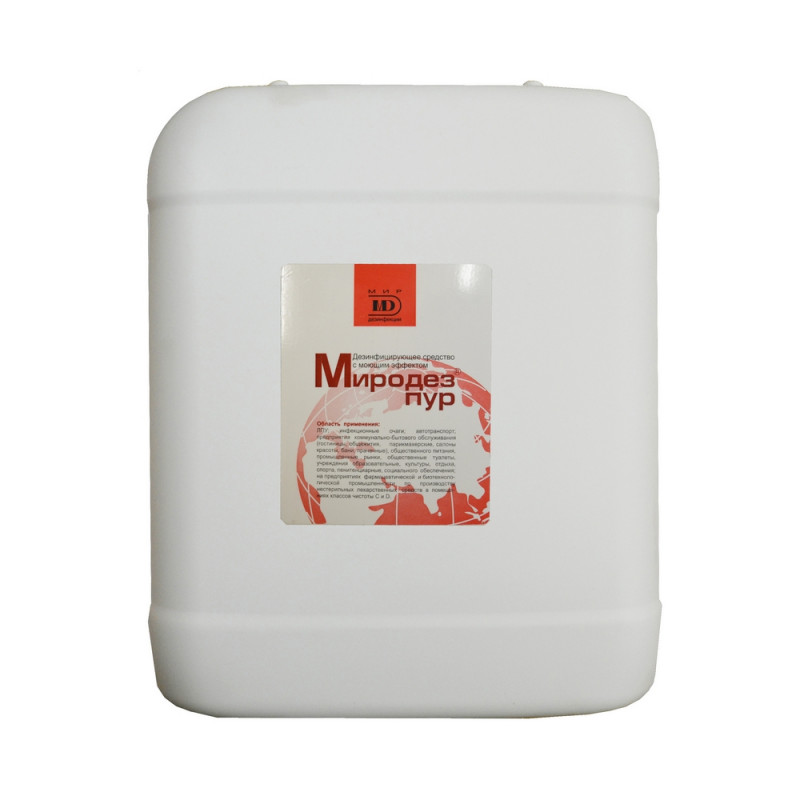 Дезинфицирующее средство Миродез Пур 5 л (концентрат). Химический состав дезсредства: ЧАС, гуанидин, поверхностно-активные вещества (ПАВ), вспомогательные компоненты. Действующие вещества: алкилдиметилбензиламмоний хлорид (АДБАХ) + дидецилдиметиламмоний хлорид 2 %, полигексаметиленгуанидин гидрохлорид (ПГМГ) 2.5 %, вспомогательные компоненты, ПАВы. Сфера применения: акушерские стационары, лпу, клинические лаборатории, бактериологические лаборатории, детские учреждения (детсады, школы и т.п.), пенитенциарные учреждения, инфекционные очаги, предприятия общественного питания, потребительские рынки, коммунальные объекты (бани, бассейны, гостиницы, общественные туалеты и т.п.), учреждения соцобеспечения, парикмахерские, косметические и (или) массажные салоны, прачечные, санитарный транспорт, отделения неонатологии, предприятия фармацевтической промышленности, учреждения культуры, отдыха (кинотеатры, музеи, театры), спортивные и культурно-оздоровительные комплексы, объекты курортологии, диагностические лаборатории, морги и ритуальные учреждения. Объекты обработки: белье нательное, белье постельное, жесткая мебель, игрушки, ИМН одноразовые перед утилизацией, лабораторная посуда, мед. отходы из текстильных материалов (ватные и марлевые тампоны, марля, бинты), мусоросборочное оборудование, мусоропроводы, обувь из пластика, резины, одноразовая посуда, поверхности в помещениях, поверхности приборов и аппаратов, предметы для мытья посуды, предметы личной гигиены, предметы ухода за больными, резиновые и полипропиленовые коврики, санитарно-техническое оборудование, санитарный транспорт, столовая посуда, транспорт для перевозки пищевых продуктов, уборочный инвентарь. Основные режимы применения средства (концентрация/время): Дезинфекция поверхностей по бактериям (исключая туберкулез) (0.1 %/60 мин., 0.2 %/30 мин., 0.4 %/15 мин., 1 %/5 мин.), Дезинфекция поверхностей по вирусным инфекциям (0.5 %/30 мин., 1 %/15 мин.), Дезинфекция поверхностей по кандидозу (0.3 %/60 мин., 0.5 %/30 мин., 1 %/120 мин.), Дезинфекция поверхностей по дерматофитам (0.5 %/120 мин., 0.8 %/90 мин., 1 %/60 мин.), Дезинфекция поверхностей по туберкулезу (0.8 %/60 мин., 1.2 %/30 мин., 1.5 %/15 мин.). Класс опасности: при введении в желудок - 4; при нанесении на кожу - 4; рабочего раствора - 4. Активно в отношении: - бактерии (Mycobacterium tuberculosi, грамотрицательные бактерии, грамположительные бактерии); - вирусы (аденовирусы, атипичной пневмонии, вич, герпеса, грипп, парагрипп, парентеральных гепатитов, полиомиелит, прочие возбудители орви, птичьего гриппа (h5n1), ротавирусы, энтеральных гепатитов, энтеровирусы); - патогенные грибы (дерматофитон, кандида, плесневые грибы). Особые свойства: сохранение свойств при замораживании/размораживании, не обесцвечивает ткани, не фиксирует органические загрязнения, не агрессивно по отношению к объектам обработки. Срок годности: в упаковке - 5 лет, в рабочем растворе - 14 дней. Страна производства: Россия.