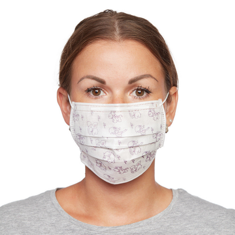Маска медицинская трехслойная на резинках одноразовая с рисунком. Имеет носовой фиксатор длиной 8 см для более плотного и комфортного прилегания маски в области носа. Размер: 17,5x 9,5 см. Трехслойная: 2 наружных слоя изготовлены из гипоаллергенного полипропиленового нетканого материала, обладающего водоотталкивающими свойствами, воздухопроницаемостью и пониженным ворсоотделением. Фильтрующий элемент (промежуточный слой) - мельтблаун. Упакована в коробки по 100 шт. Нестерильно. Срок годности 4 года. Количество штук в транспортной упаковке: 2000.