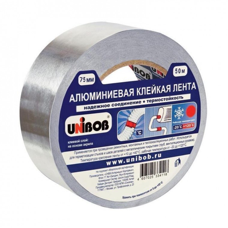 Клейкая высокопрочная алюминиевая лента Unibob. Алюминиевая клейкая лента применяется при проведении ремонтных, монтажных и теплоизоляционных работ. Металлизированная лента используется для герметизации стыков и швов деталей с металлическим покрытием (труб, вентиляционных рукавов). Обеспечивает надежное соединение и термостойкость. Клеевой слой на основе акрила обеспечивает отличную адгезию ко всем поверхностям. Лента на акриловой основе демонстрирует лучшие показатели стабильности при работе в агрессивных средах, именно поэтому её чаще всего выбирают для длительной, стабильной склейки поверхностей, которым не должны угрожать различные условия окружающей среды.