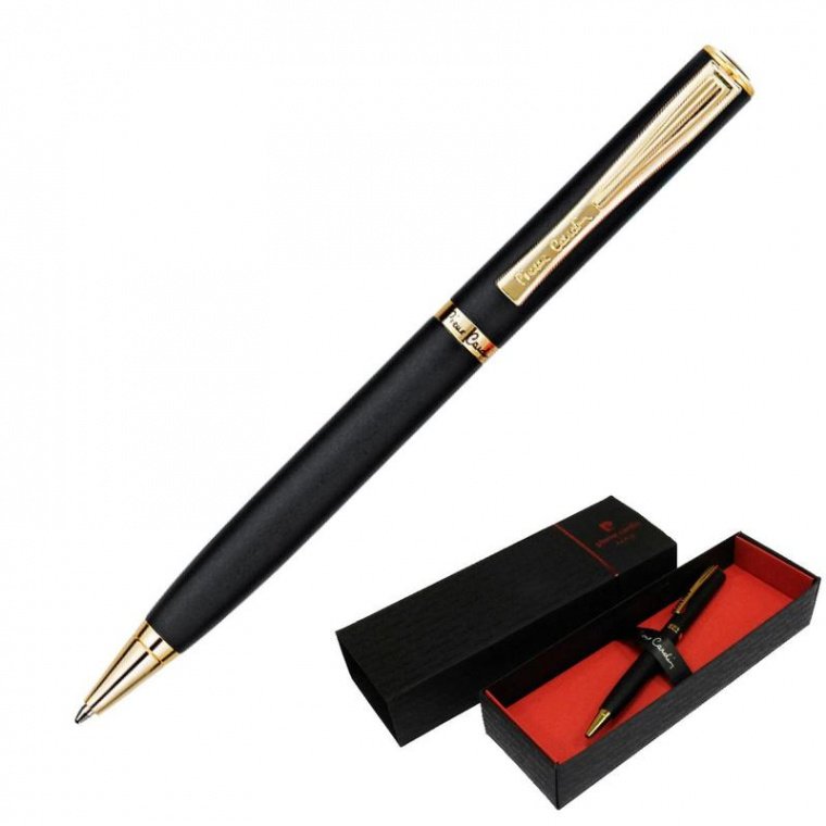 Шариковая ручка Pierre Cardin, из коллекции Eco в корпусе из латуни с матовым черным покрытием. Детали дизайна выполнены из стали с позолотой. Цвет корпуса — черный. Цвет чернил — синий. Толщина линии письма — 0,5 мм. Комплектуется пластиковым подарочным футляром с бархатистым ложементом.