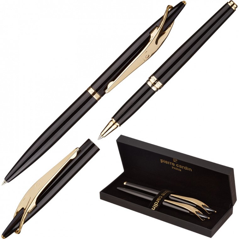 Набор пишущих принадлежностей Pierre Cardin поставляется в подарочном футляре. Шариковая ручка комплектуется стерженем с масляными чернилами черногосинего цвета.Ручка-роллер комплектуется шариковым стерженем с жидкими чернилами синего цвета. Обе ручки в корпусе из латуни, с лакированным покрытием, детали дизайна — сталь с позолотой. Цвет корпуса — черный.