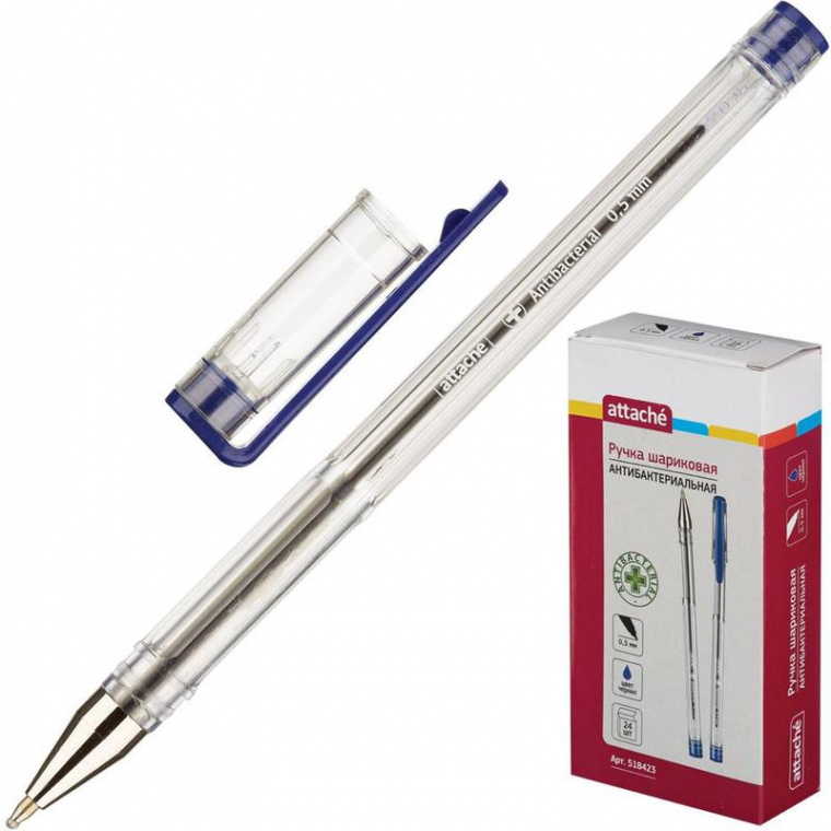 Ручка шариковая Attache Antibacterial А02 в прозрачном пластиковом корпусе с колпачком. Комплектуется стержнем с синими чернилами, позволяющим наносить линии толщиной 0,5 мм. Уникальная ручка с антибактериальным покрытием — краской, содержащей ионы серебра. Подходит для тех, кто беспокоится о своем здоровье. Заправлена масляными чернилами, которые обеспечивают мягкое и аккуратное письмо. Ручка серии Antibacterial рекомендована для школьников, студентов и сотрудников офисов. Заказать расходные материалы (или комплектующие) к этому товару вы можете через менеджеров нашего контакт-центра. Услуга доступна только для юр. лиц.
