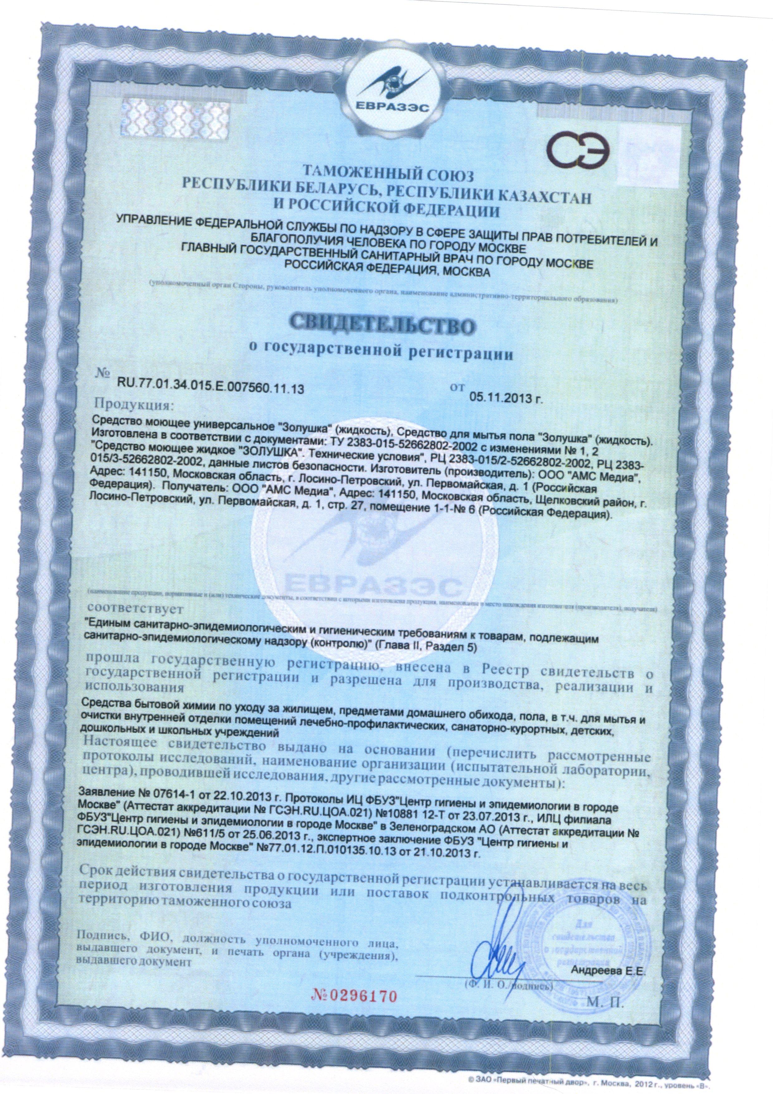 Сертификат на товар - Средство для мытья пола Золушка 1 л