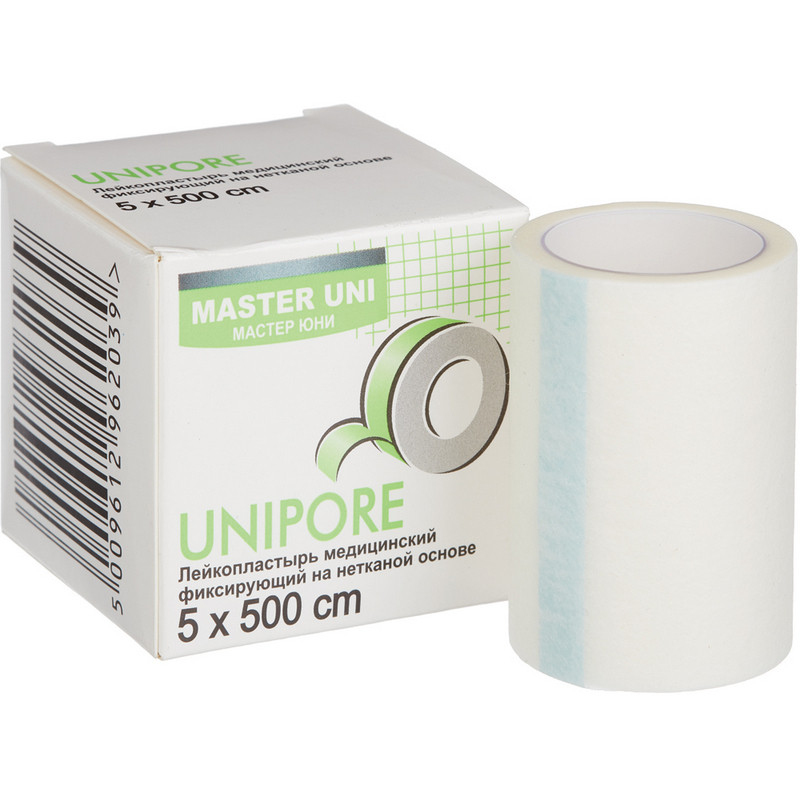 Пластырь медицинский в катушках Master Uni UNIPORE Применяется для фиксации защитных повязок, тампонов, зондов, катетеров : Основа - нетканый материал из микропористой целлюлозы отлично пропускает воздух легко отрывается руками без использования ножниц гипоаллергенный полиакрилатный клей прочно фиксирует пластырь, но удаляется без боли и не оставляет следов на коже рекомендуется для детей и людей с особо чувствительной кожей