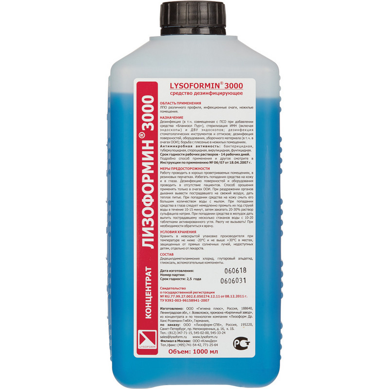 Дезинфицирующее средство 'Лизоформин-3000' 1 л (концентрат). Химический состав дезсредства: ЧАС, альдегид, вспомогательные компоненты. Действующие вещества: глиоксаль 7.5 %, глутаровый альдегид 9.5 %, дидецилдиметиламмоний хлорид 9.6 %, вспомогательные компоненты. Сфера применения: ЛПУ. Объекты обработки: гибкие эндоскопы, жесткие эндоскопы, ИМН из металлов, резин на основе натурального и силиконового каучука, стекла, пластмасс, ИМН обычные, инструменты к эндоскопам, инструменты стоматологические, инструменты хирургические, поверхности в помещениях, санитарно-техническое оборудование, стоматологические материалы (оттиски из альгината, силикона, полиэфирной смолы, зубопротезные заготовки, артикуляторы), уборочный инвентарь. Основные режимы применения средства (концентрация/время): дезинфекция поверхностей по бактериям (исключая туберкулез) (0.1 %/300 мин.), дезинфекция поверхностей по вирусным инфекциям (0.25 %/240 мин., 0.5 %/90 мин.), дезинфекция поверхностей по кандидозу (0.25 %/240 мин., 0.5 %/90 мин.), дезинфекция поверхностей по дерматофитам (0.25 %/240 мин., 0.5 %/90 мин.), дезинфекция ИМН при бактериальных, вирусных инфекциях и кандидозе (0.75 %/60 мин., 1.5 %/30 мин., 2 %/15 мин.), дезинфекция, совмещенная с псо ИМН при бактериальных, вирусных инфекциях и кандидозе (1.5 %/30 мин.), дву эндоскопов (8 %/5 мин.), стерилизация изделий медицинского назначения (8 %/60 мин.). Класс опасности: при введении в желудок - 3; при нанесении на кожу - 4; рабочего раствора - 4. Активно в отношении: - бактерии (Mycobacterium tuberculosi, грамотрицательные бактерии, грамположительные бактерии); - вирусы (грипп, парагрипп, Прочие возбудители ОРВИ); - возбудители особо опасных инфекций (мелиоидоз, сап, сибирская язва, туляремия, холера, чума); - патогенные грибы (дерматофитон, кандида). Срок годности: в упаковке - 2,5 года, в рабочем растворе - 14 дней. Страна производства: Россия.