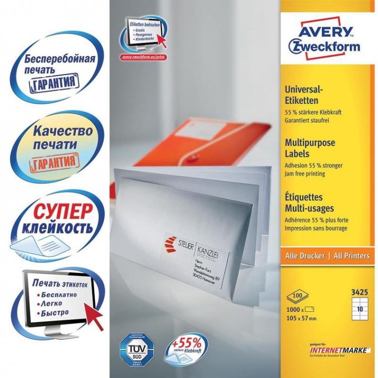 Этикетки самоклеящиеся Avery Zweckform белые 105х57 мм (10 штук на листе A4, 100 листов, артикул производителя 3425)