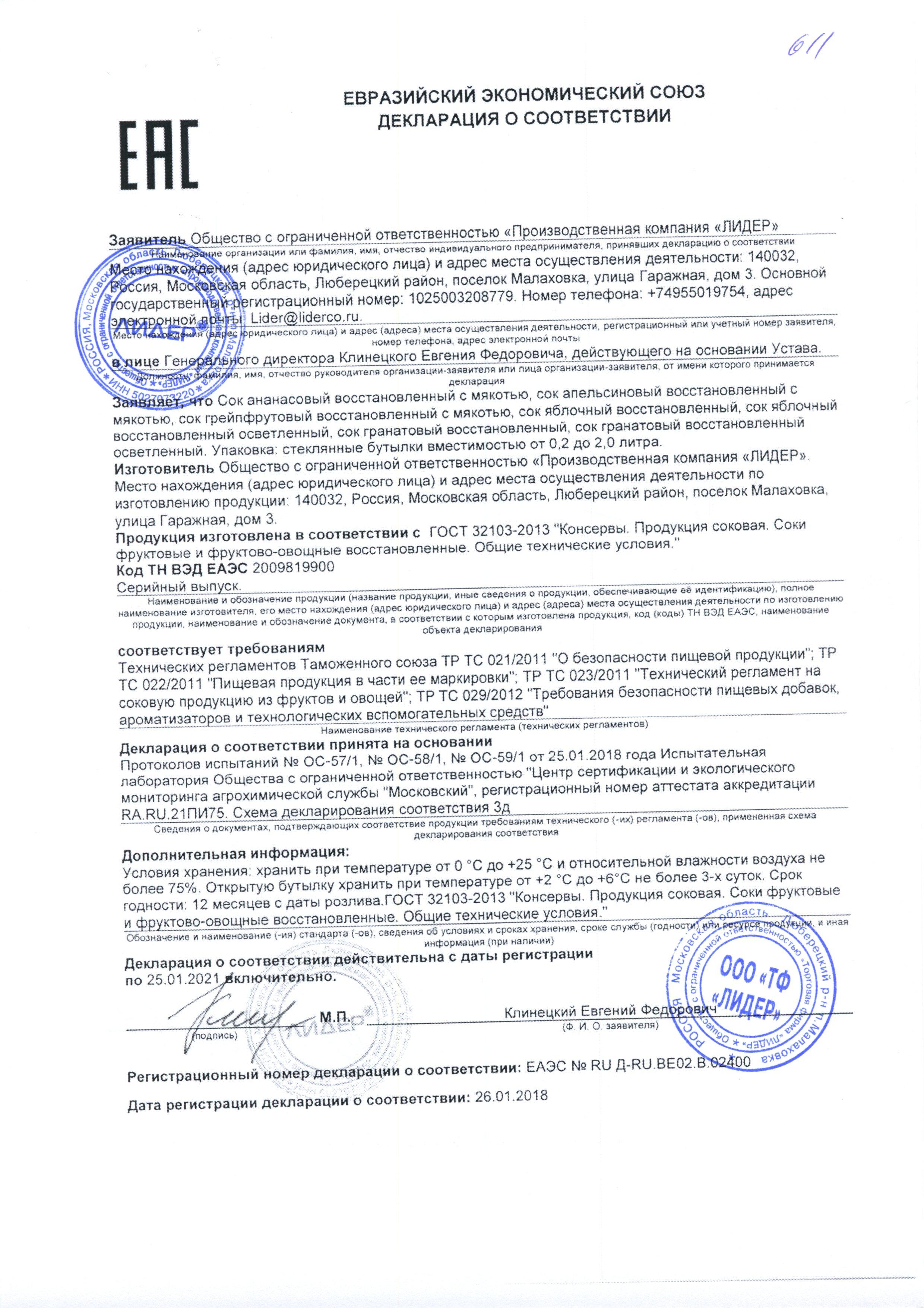 Состав: сок ананасовый (изготовлен из концентрированного сока), загуститель — пектин. Без консервантов и красителей. Не используется химическая обработка продукта и тары. Тип упаковки: стеклянная бутылка.