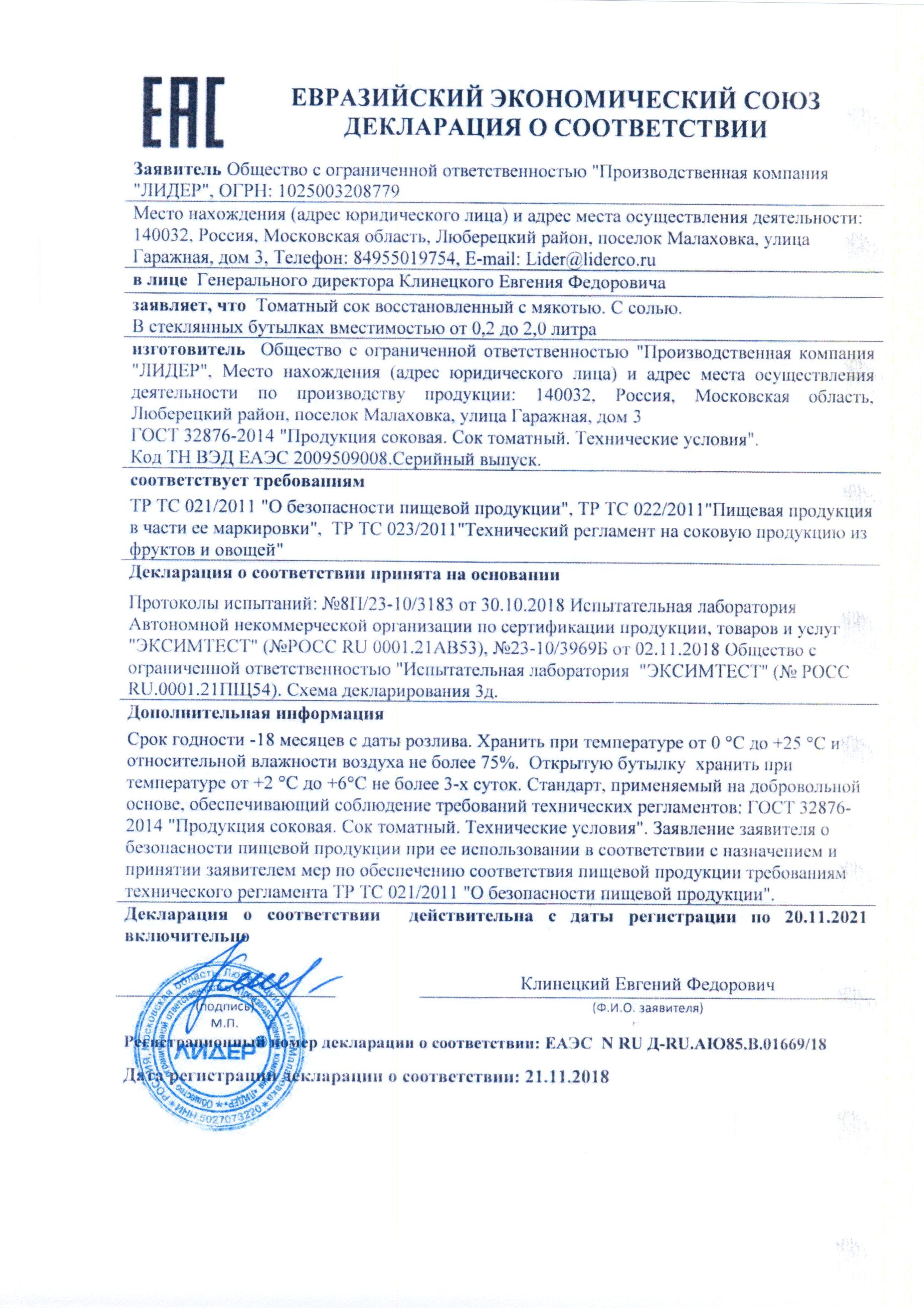 Состав: томатный сок (изготовлен из концентрированного сока), соль поваренная пищевая. Без консервантов и красителей. Допускается отслаивание жидкости при хранении. Перед употреблением взбалтывать! Не используется химическая обработка продукта и тары. Тип упаковки: стеклянная бутылка.
