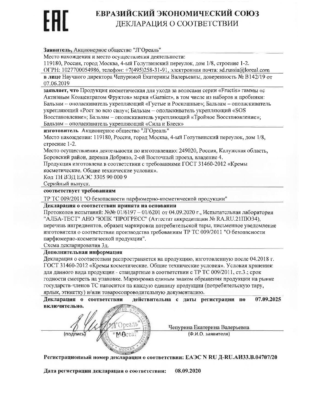 Сертификат на товар - Бальзам-ополаскиватель Garnier Fructis Рост во всю силу для ослабленных волос 200 мл
