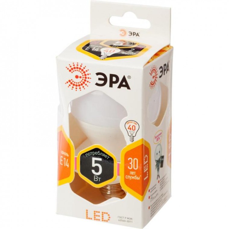 Светодиодная лампа Эра 5W E14 2700k излучает приятный теплый белый свет. Лампа светодиодная Эра обладает традиционным цоколем Е14 и сферической формой белого матового корпуса. Не мерцает (полноценный драйвер). Лампы такого диапазона утром способствуют мягкому пробуждению, настраивают на положительный лад и стимулируют деятельность. Также эти оттенки хороши для применения в вечернее время из-за их успокаивающего эффекта. Расслабляющий эффект пригодится в кафе, барах и ресторанах, где посетители будут чувствовать себя спокойно, или дома, для создания уютной атмосферы. Еще такие лампы часто используются в салонах мебели и освещении витрин в зимнее время. Параметры лампочки (длина 13 см, диаметр 4.5 см) делают представленную модель идеальной для использования с люстрами, светильниками и бра. Дополнительный плюс — расход электричества представленной моделью не превышает 5 Вт. При этом по яркости света она соответствует стандартной 40-ваттной лампе накаливания.