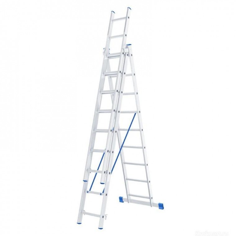 Алюминиевая 3×9 ступеней трехсекционная Сибртех. Используется в быту — дом, сад, гараж, а так же коммунальной и строительной деятельности. Такая стремянка незаменима при выполнении работ на большой высоте при строительстве, ремонте и прочих хозяйственных и оформительских работ. Данная стремянка предназначена для работы ручным инструментом.ПреимуществаТелескопическая лестница-стремянка Сибртех 3×9 ступеней изготовлена из легкого алюминия. Двусторонняя стремянка предполагает наличие ступеней с противоположной стороны; такая стремянка незаменима при проведении трудоемких работ, требующих сторонней поддержки, рабочие процессы можно выполнять вдвоем, находясь на стремянке с разных сторон. При этом, двухсторонний расставной тип конструкции стремянок является наиболее устойчивым вариантом конструкции. Телескопическая или выдвижная характеристика предусматривает применение для высотных работ. Состоит из двух перекрывающихся частей, которые могут быть сдвинуты друг от друга, чтобы обеспечить требуемую регулировку высоты. При полном раздвижении конструкции, стремянка превращается в лестницу приставного типа. Рама стремянки Сибртех 3×9 представляет собой прессованный алюминиевый профиль прямоугольного сечения. Алюминий — легкий материал, не подверженный коррозии. Четыре рабочих положения лестницы: стремянка, стремянка с высокой выдвижной секцией, двухсторонняя стремянка, приставная лестница. Верхний и центральный элементы лестницы-стремянки оснащены специальным защитным устройством от случайного опускания и складывания. Прочная алюминиевая рама из прессованного профиля прямоугольного сечения.Прочная конструкцияСтремянка выдерживает нагрузку до 150 кг.ЭргономичностьНа такой стремянке можно работать в условиях повышенной влажности без вреда для инструмента. Заглушки из ПВД (полиэтилена высокого давления марки 15803 по ГОСТ 16337-77) на ножках стремянки повышают устойчивость. Заглушки не дают стойкам стремянки разъезжаться на скользкой поверхности и защищают напольное покрытие от повреждений и царапин. Стяжка безопасности (ограничительная лента) и распорки с фиксацией являются основой защиты от раскладывания стремянки, ограничительная тесьма изготовлена из прочного полиэстера. Рабочая высота стремянки представляет собой рост человека до плеч, прибавленный к размеру лестницы. Вес лестницы-стремянки 10,8 кг. Простая сборка и разборка изделия, компактные транспортировочные габариты.
