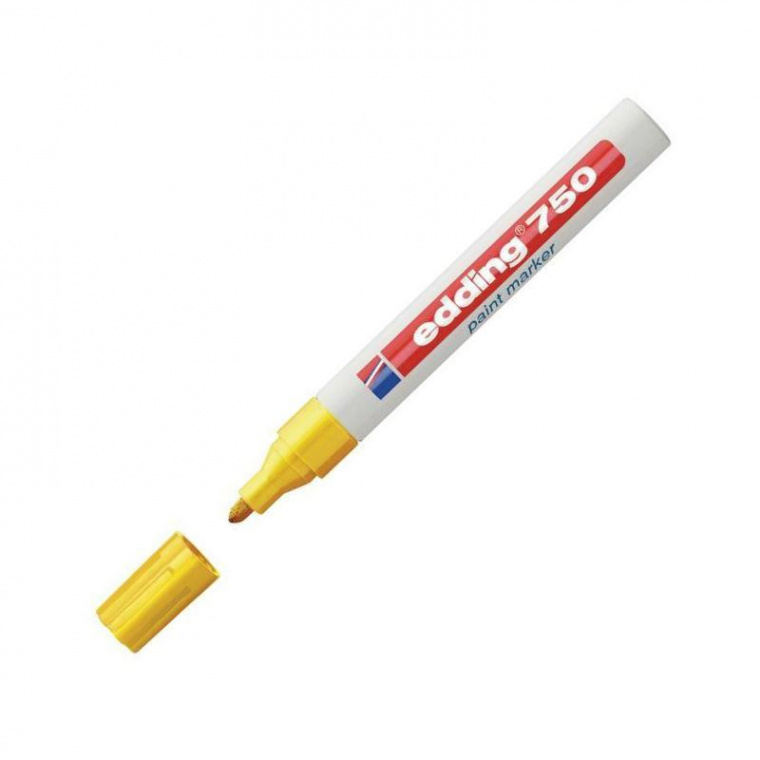 Универсальный маркер Edding 750, цвет чернил — желтый, используется для промышленной непрозрачной маркировки практически всех материалов, например, стекла, пластика, дерева или металла. Может применяется для письма на жирных, пыльных, грязных поверхностях. Лаковый маркер устойчив к кислотам, растворителям, механическому истиранию, свету. Высококонцентрированный пигмент хорошо ложится на гладкие и шероховатые поверхности. Специальные добавки, введенные в состав маркера Edding E 750 растворяют, масляную пленку на поверхности письма. Непрозрачные лаковые чернила позволяют делать хорошо заметные надписи густым плотным слоем даже на темных поверхностях. Корпус промышленного маркера изготовлен из алюминия. Маркер Edding E 750 имеет упроченный круглый (пулевидный) наконечник. Наконечник маркера может быть заменен по мере истирания. Благодаря тонкому наконечнику, маркером может наноситься маркировка на небольшие элементы и поверхности. Толщина линии — 2-4 мм. Поток чернил регулируется клапаном. Чернила маркера с лакирующим эффектом на основе нитрокраски. Водостойкий, быстро сохнет. Термостойкость надписи до 1000 градусов по Цельсию. Надписи цветами 06-010, 049, 054 также видимы до 1000 С. Термостойкость остальных цветов — до 400 градусов по Цельсию. Маркер Edding E 750 хорошо зарекомендовал себя в работе при перепадах температур от −15 до 30. Промышленный лаковый маркер Edding Е-750 универсален. Используется, например, при нанесении меток на разнородные материалы. При маркировке изделий из резины, пластика, стекла, металла, кабеля, проводов, при нанесении маркировки на товары достаточно одного маркера — Edding E 750. Идеально подходит для маркировки грузов, приборостроения, технологической маркировки. Кроме того, маркер Edding E 750, благодаря разнообразной палитре цветов и свойствам красящего вещества, широко используется для декоративных и оформительских работ дизайнерами. используется в витражных работах, росписи по дереву и керамике, для других интерьерных работ. Инструкция по применению маркера: 1. Перед использованием хорошенько встряхнуть с закрытым колпачком. 2. Снимите колпачок, прижмите наконечник к поверхности, надавите и удерживайте пока не проступит краска. 3. Применять после того как убедитесь, что вытекает исходный цвет. Предостережение: плотно закрывайте колпачок после применения, держать маркер вдали от огня и прямых солнечных лучей.